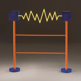 in metallo laccato nei toni del blu e dell’arancio, neon giallo