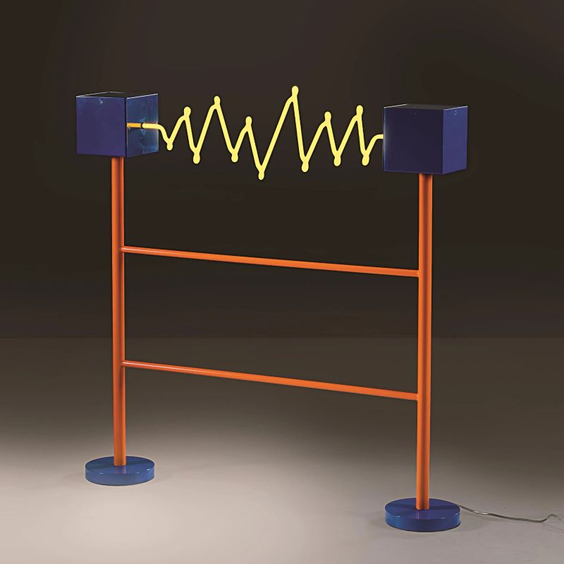 FLOOR LAMP, BLUE AND ORANGE LACQUERED STRUCTURE AND YELLOW NEON