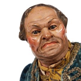 Testa in terracotta policroma, mani e piedi in legno dipinto, occhi in vetro, manichino in fil di ferro ricoperto di stoppa, abbigliato con camicia bianca, panciotto in velluto marrone gallonato oro, cappotto in velluto blu con ricami in oro, brache in tela beige, in vita fusciacca a quadri, sulla testa porta un cappello e al collo un fazzoletto giallo, alt. cm 42; accessori: bastone e pugnale