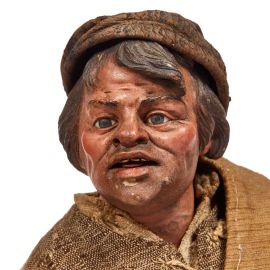 Testa in terracotta policroma, mani e piedi in legno dipinto, occhi in vetro, manichino in fil di ferro ricoperto di stoppa, abbigliato con giacca in panno marrone chiusa da cintura in pelle, brache in tela marrone, così come il mantello sulle spalle, sulla testa porta un berretto e ai piedi ciocie, alt. cm 37,5; accessori: zampogna