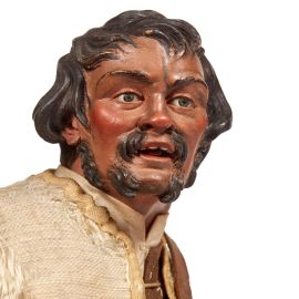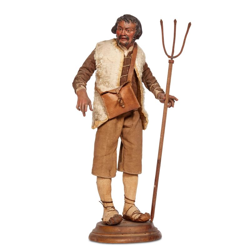Testa in terracotta policroma, mani e piedi in legno dipinto, occhi in vetro, manichino in fil di ferro ricoperto di stoppa, abbigliato con pantaloni e giacca in tela marroni, camicia bianca, gilet in pelliccia, borsello a tracolla in cuoio e ciocie ai piedi, alt.cm 34,5; accessori: forcone