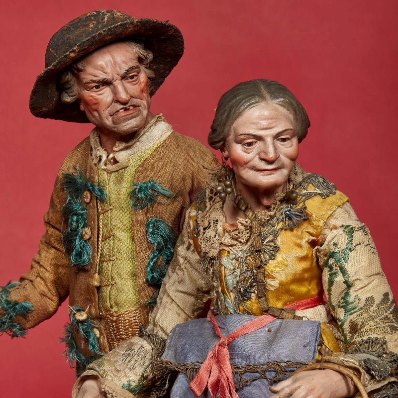Testa in terracotta policroma, mani e piedi in legno dipinto, occhi in vetro, manichino in fil di ferro ricoperto di stoppa, abbigliato con camicia in broccato verde, brache in broccato giallo e oro con fusciacca cinta in vita, giacca in tela con ricami sul verde, sulla testa porta un cappello, alt. cm 33,5; accessori: bastone