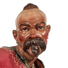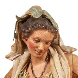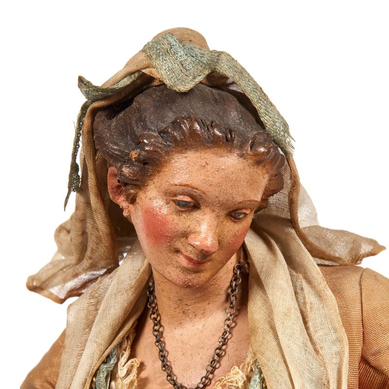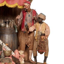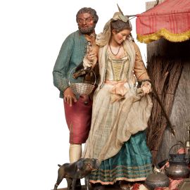 Composto da: Villano nobile, attribuibile a Filippo Tagliolini (Fogliano di Cascia, 1745 – Napoli, 1809), abbigliato con fazzoletto a righe al collo, camicia a due bottoni, panciotto e giacca blu in seta operata con bottoni, cintura in cuoio a fermare un coltello, brache in seta rossa gallonate in oro, calze in seta bianca, alt. cm 39. Giovane donna borghese, attribuibile ad Angelo Viva (Napoli, 1768-1837), abbigliata con nastro e velo sulla testa, camicia di trine, corpetto chiaro gallonato, giacca in seta con risvolti delle maniche in velluto, fazzoletto sulle spalle, gonna verde con orlo in seta rosa e galloni dorati, grembiule bianco stretto in vita da fiocco rosa, alt. cm 36,5. Orientale circasso con baffi e zuccotto rosso, attribuibile a Michele Gaudioso (attivo a Napoli nel 1780 circa) abbigliato con camicia e brache in stoffa a quadri, gilet rosso con ricami, cintura a fasce in vita, alt. cm 34,5. Paggio moro con turbante, nei modi di Nicola Ingaldi (attivo a Napoli nella seconda metà del XVIII secolo), abbigliato con camicia a righe, gilet con ricami, brache a quadri, cintura a fasce in vita, alt. cm 28. Cane, in terracotta policroma, cm 8x15x4,5.