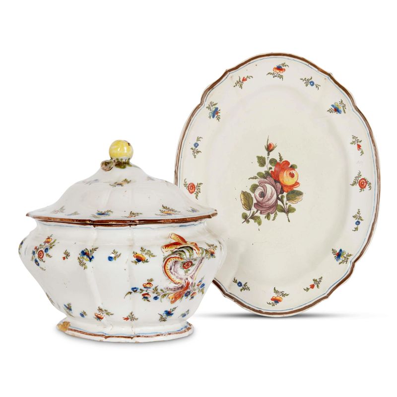 in maiolica dipinta in policromia, zuppiera ovale con basso piede, corpo rigonfio alla spalla, anse rocaille, dotata di coperchio dal profilo mistilineo che riprende le forme della vasca ed è sormontato da una presa a forma di limone. La zuppiera è completata da presentatoio ovale con tesa e orlo mistilinei, bordata color caffè. Il decoro a piccoli fiori fortemente stilizzati e piccoli fiori recisi ricopre in modo contenuto la superficie dei pezzi associati, ma soprattutto un gruppo di fiori al centro del vassoio richiama le scelte decorative del fornimento della farmacia di Novara; zuppiera cm 21,5x31x22, vassoio cm 24,5x31,5