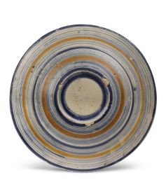 in maiolica decorata con blu di cobalto, giallo, giallo arancio e verde ramina. Il piatto presenta la caratteristica forma con ampia svasatura e cavetto profondo separato dalla tesa da un gradino smussato, la tesa orizzontale e terminante in un orlo arrotondato. Il retro, privo di piede, ha un appoggio appena incavato. Al centro della composizione un giovane paggio è ritratto di profilo, rivolto a sinistra, con i capelli lunghi ricadenti sulle spalle e trattenute da una fascia, vestito di un giustacuore ricamato; il profilo ombreggiato e inserito in un medaglione riempito da puntinature. Tutto intorno si sviluppa un ornato a cornici concentriche decorate da motivi a embricazioni, a crocette, spirali concentriche, perlinature, ornati a nodo e a dente di lupo con campiture riempite da puntinature.Il piatto costituisce un valido esempio della produzione tardo quattrocentesca a Faenza e ben s’inserisce nella vasta famiglia delle “Belle” che, talvolta propone, al centro della composizione, un ritratto maschile. Il retro è decorato con filettature concentriche, note comunemente come motivo “a calza” nei colori giallo ocra e blu; diam. cm 27,5, diam. piede cm 9,5, alt. cm 4,5
