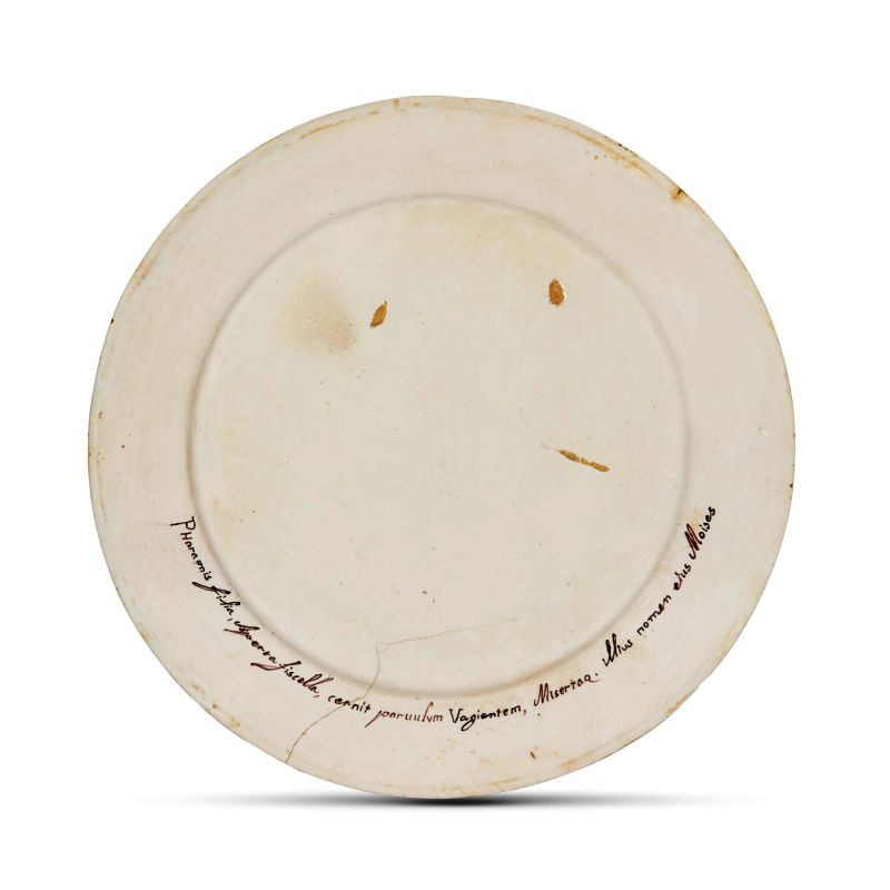 in maiolica in policroma a gran fuoco di forma circolare con cavetto piano, tesa orizzontale e bordo arrotondato. La decorazione, che interessa l’intera superficie del piatto, rappresenta l’episodio biblico di Mosè salvato dalle acque, secondo l’iconografia derivata dall’incisione di Cesare Fantetti realizzata per la serie Imagines Veteris Ac Novi Testamenti A Raphaele Sanctio Urbinate in Vaticani Palatii Xystis, pubblicata a Roma da Giovanni Giacomo De Rossi nel 1675. Iscritto sul retro in inchiostro bruno Pharaonis filia, Aperta fiscella, cernit paruulum Vagientem, Misertaq. Illius nomen eius Moyses; diam. cm 25,5, alt. cm 2,5