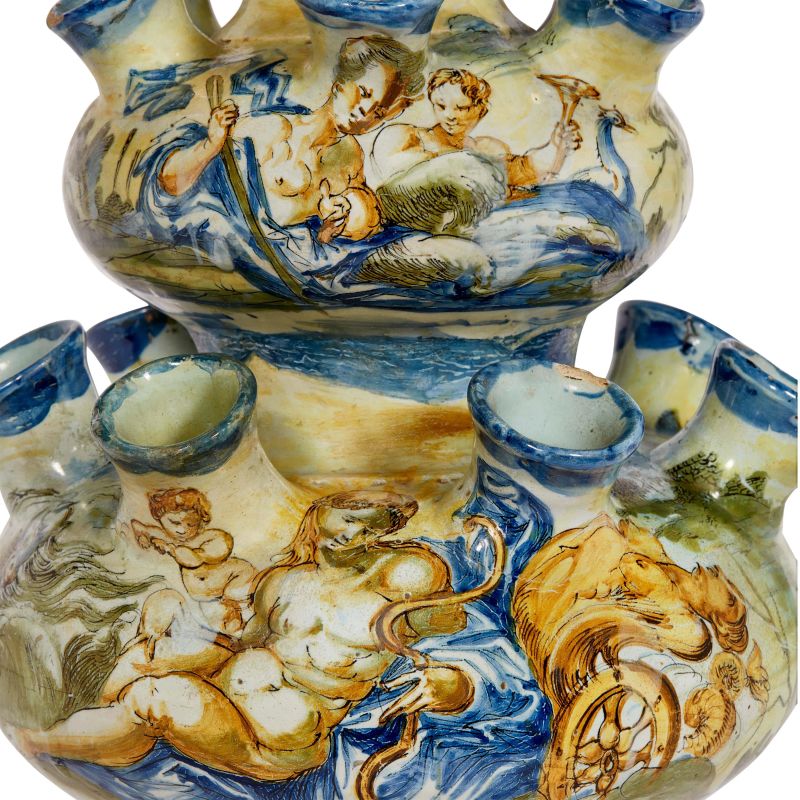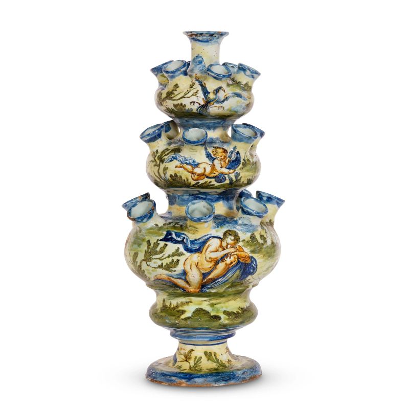 in maiolica dipinta in policromia, corpo a balaustro costituito da tre corpi globulari schiacciati, di misure digradanti, caratterizzati ciascuno nella parte superiore da molteplici tubetti portafiori con uno più grande sulla sommità. L’intera superficie mostra una decorazione policroma del tipo “istoriato barocco” con il carro di Aurora trainato dai cavalli Lampo e Fetonte, una coppia di ninfe accompagnate da un cigno, un vecchio morente a simboleggiare il giorno passato, il tutto accompagnato da putti, uccelli, cespugli e casolari. Arrigo Cameirana, che ha redatto la scheda per la pubblicazione del vaso nel Thesaurus, sottolinea come le analogie con il Carro del Sole, affrescato nella casa savonese del nobile Lelio Gavotti (ex Monte di Pietà), suggeriscano un’attribuzione a Bartolomeo Guidobono, probabilmente nella fabbrica del padre Gio Antonio tra il 1680 e il 1683, certamente dopo il viaggio di studio a Parma, Venezia e Bologna; alt.cm 44,5, diam. piede cm 14,8