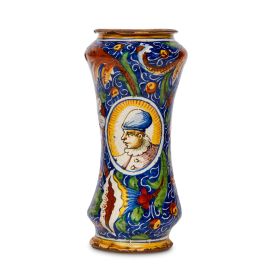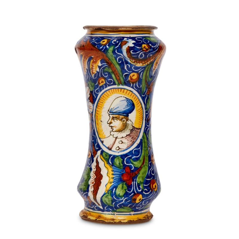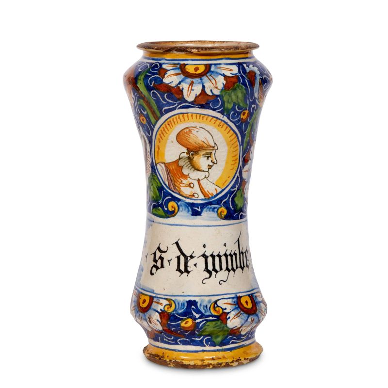 in maiolica dipinta in policromia, corpo cilindrico rastremato al centro, piede basso ed espanso, spalla rigonfia arrotondata, collo breve con orlo estroflesso. L’ornato, ispirato all’impostazione tradizionale, si distingue per la presenza di un doppio medaglione, ma soprattutto per la presenza abbastanza insolita di un ampio cartiglio farmaceutico (iscritto S.de.nimbe) posto al di sotto di uno dei due ovali. Entrambi i medaglioni mostrano una giovane figura maschile a mezzo busto vestita di farsetto a bottoni gorgiera e cappello a sacco, mentre tutto attorno si sviluppa il classico decoro fogliato e floreale con girali, corolle e piccoli frutti su fondo blu; alt. cm 31,6, diam. bocca cm 12, diam. base cm 11,8