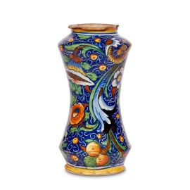 in maiolica dipinta in policromia, corpo cilindrico rastremato al centro, piede basso ed espanso, spalla rigonfia arrotondata, collo breve con orlo estroflesso. L’ornato segue l’impostazione tradizionale: al centro di un medaglione la raffigurazione di santa Caterina d’Alessandria; dipinta con perizia calligrafica e lumeggiata di bianco di stagno, la figurina si staglia sul fondo bianco bordato da una fascia gialla con doppia cornice blu e cornice a punte. Tutto attorno il classico decoro fogliato e floreale con girali, corolle e piccoli frutti su uno spesso fondo blu con sottili graffiture; alt. cm 29,6, diam. bocca cm 11, diam. base cm 12,5