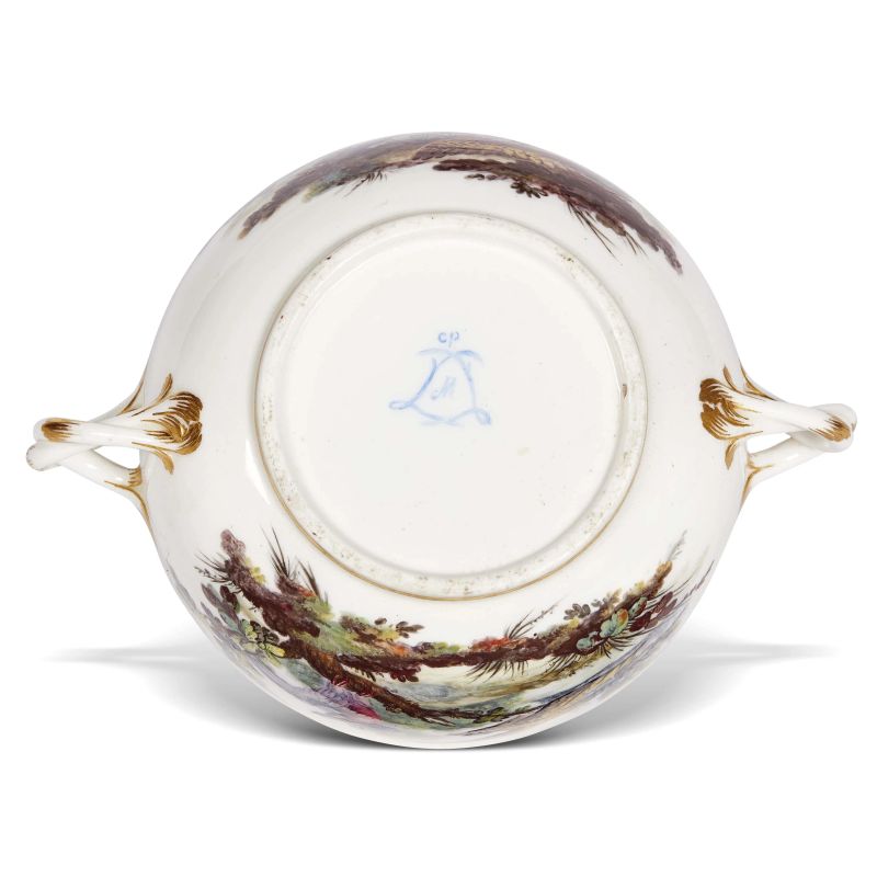 in porcellana dipinta in policromia e oro, corpo circolare con due anse a doppia estremità foliata intrecciata, coperchio a cupola con presa analoga. Il decoro su fondo bianco mostra delle vivaci scenette con uccelli variopinti, mentre i bordi sono orlati a dentello in oro. Queste piccole ciotole basse erano usate per servire zuppe, brodi e altre vivande simili, in Francia denominate "écuelle": essendo realizzati per uso personale, erano solitamente finemente decorate. La marca riportata in blu sul fondo con le lettere CP si riferisce al pittore Antoine-Joseph Chappuis il maggiore, attivo in manifattura come pittore di fiori e uccelli tra il 1761 e il 1787. Etichetta di provenienza S. Giusti / U. Podestà – Milano all’interno della tazza; cm 12,6x19,8x14,5