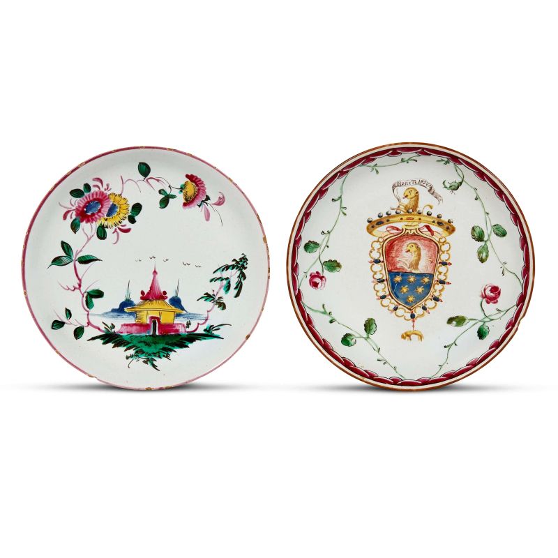in maiolica dipinta in policroma di forma circolare, testimonianza di una piccola collezione della produzione emiliano-romagnola del XVIII secolo. Il piccolo piatto con le rovine in verde, l’unico dall’orlo sagomato, è opera di Filippo Comerio attivo nella manifattura Ferniani, diam. cm 11,7; il piattino a fondo spugnato, con al centro un emblema nobiliare, è anch’esso ascrivibile alla manifattura Ferniani verso la metà del secolo, diam. cm 11,7; quello con stemma con cimiero e motto nobiliare è opera della manifattura bolognese Fink, siglato al verso, come pure il piatto con pagoda, entrambi riferibili al terzo quarto del secolo XVIIII, diam. cm 12,4 e cm 12,5 rispettivamente