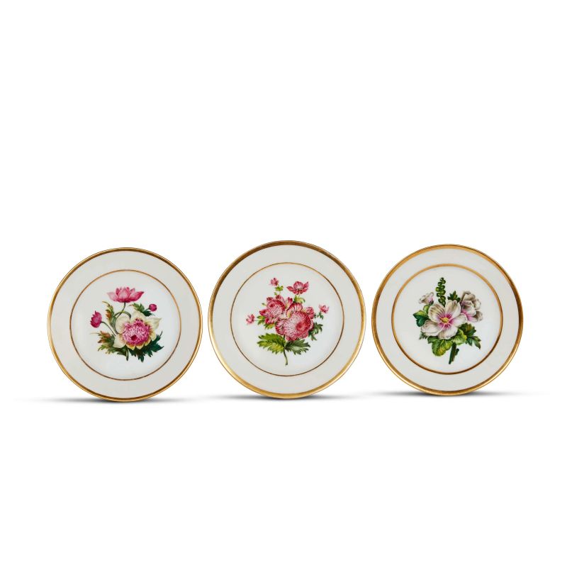in porcellana dipinta in policromia, di forma piana su piede ad anello. Recano al fronte una decorazione a mano con fiori naturalistici, mentre la balza e l’orlo sono sottolineati da una fascia di oro. Questi esemplari ben rappresentano la produzione della manifattura parigina attiva a partire dalla eredità della manifattura di Rue du Fauburg Saint Denis, a cura di March, e poi protrattasi fino al 1834 a cura del figlio Victor Schoelcher, invero più noto per il decreto sull’ abolizione della schiavitù in Francia. Le opere della manifattura, inizialmente in stile Impero con riproduzione di paesaggi, approdano poi a questi elegantissimi decori. Al verso marca della manifattura redatta in rosso Schoelcher ed etichetta S. Giusti- U.Podestà / antiquari Milano; diam. cm 22,5