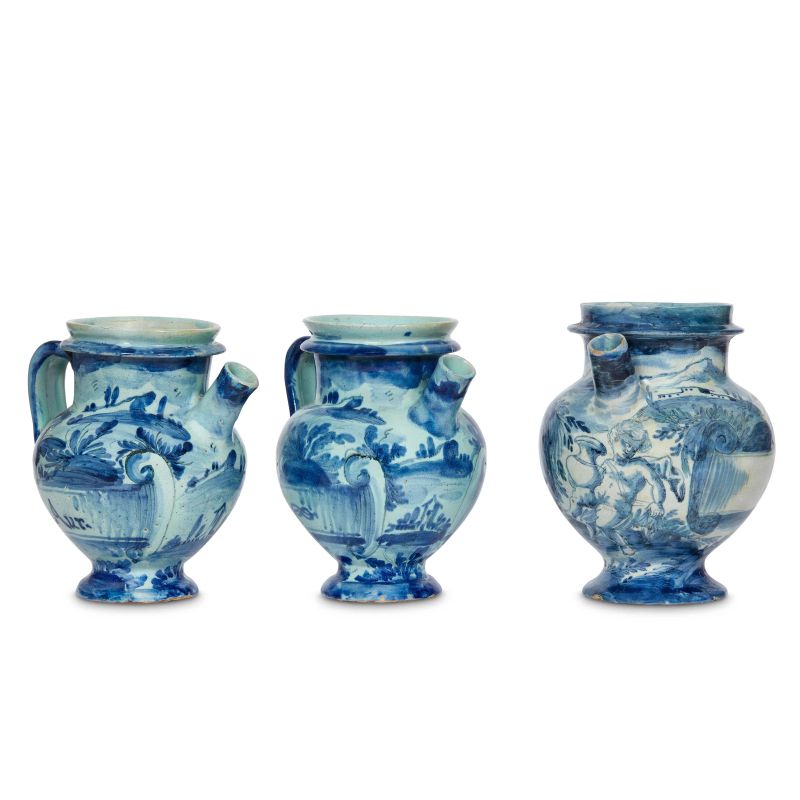 in maiolica dipinta in monocromia azzurra, corpo ovoidale con alto collo cilindrico con anello all’imboccatura, ansa a nastro, piede a calice alto e cannello cilindrico. L’intera superficie è decorata con scene paesaggistiche con figurine di putti barocchi, interrotte dalla fascia che ospita l’iscrizione del relativo prodotto farmaceutico. Marche della manifattura in blu sotto il piede; alt. cm 20,2, diam. bocca cm. 11, diam. piede cm. 8,8 la coppia e cm alt. cm 21, diam. bocca cm 11,4, diam. piede cm 10,5