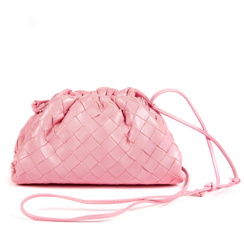 Nell'iconica morbida pelle intrecciata, qui in un carinissimo rosa confetto, con effetto arricciato lungo la chiusura. La tracolla può facilmente esser messa all'interno per un indosso a mano. Corredata di dustbag originale.