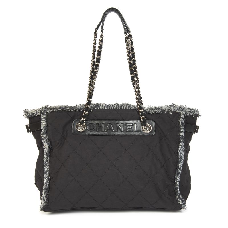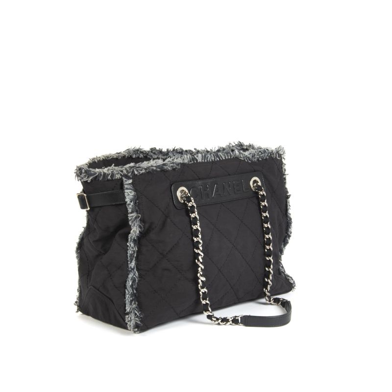 In tessuto nero con frange grigio/nero illuminate da lurex; catena in color argento intrecciata con nastro nero. Logo a rilievo sulla parte frontale in pelle e sugli anelli metallici. Fodera in tessuto grigio chiaro con doppia tasca.