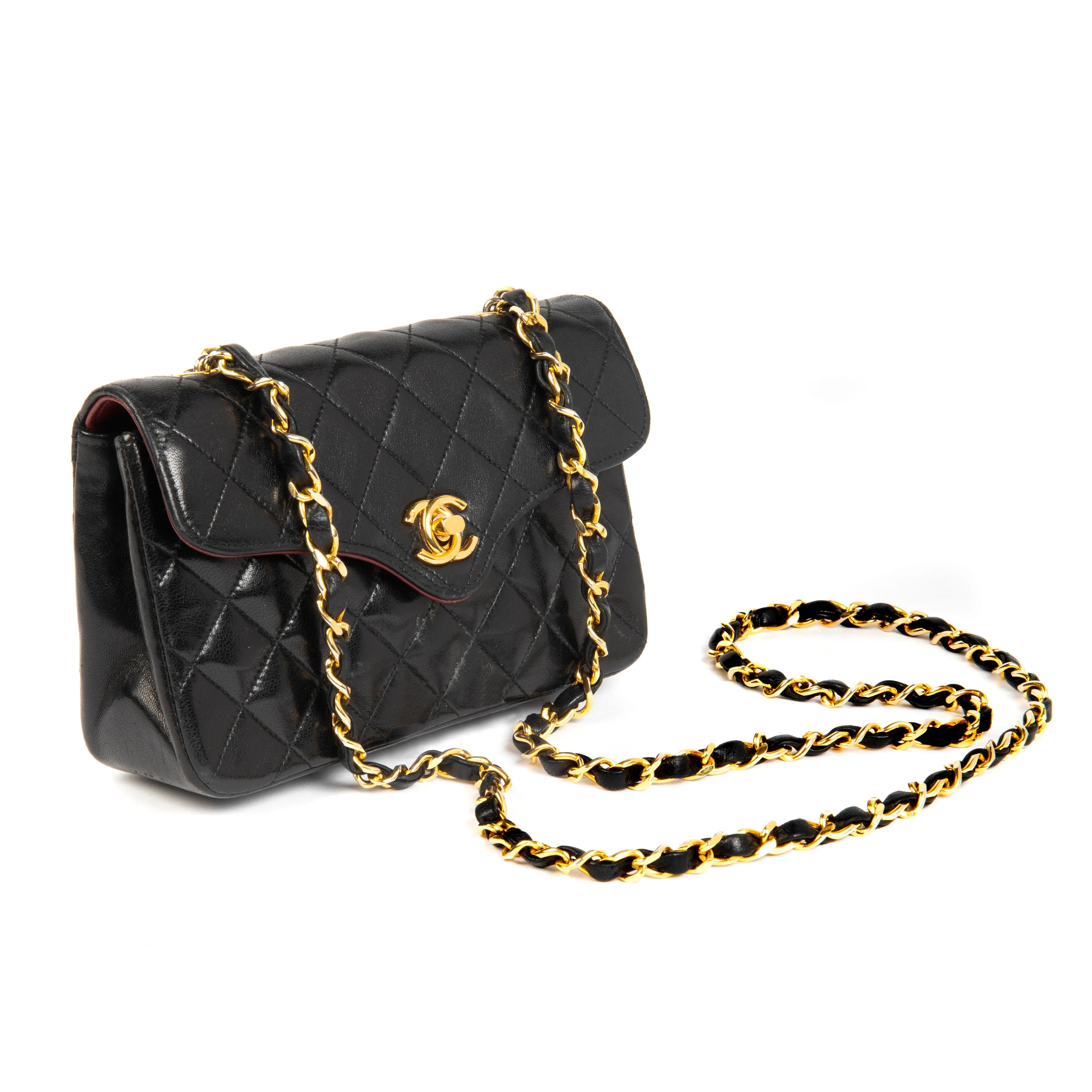 Piccola tracolla vintage in pelle nera trapuntata con iconica chiusura frontale e tracolla a catena con intreccio in pelle; fodera in pelle rosso scuro e parti metalliche color oro. Corredata di scatola originale e ID Card.