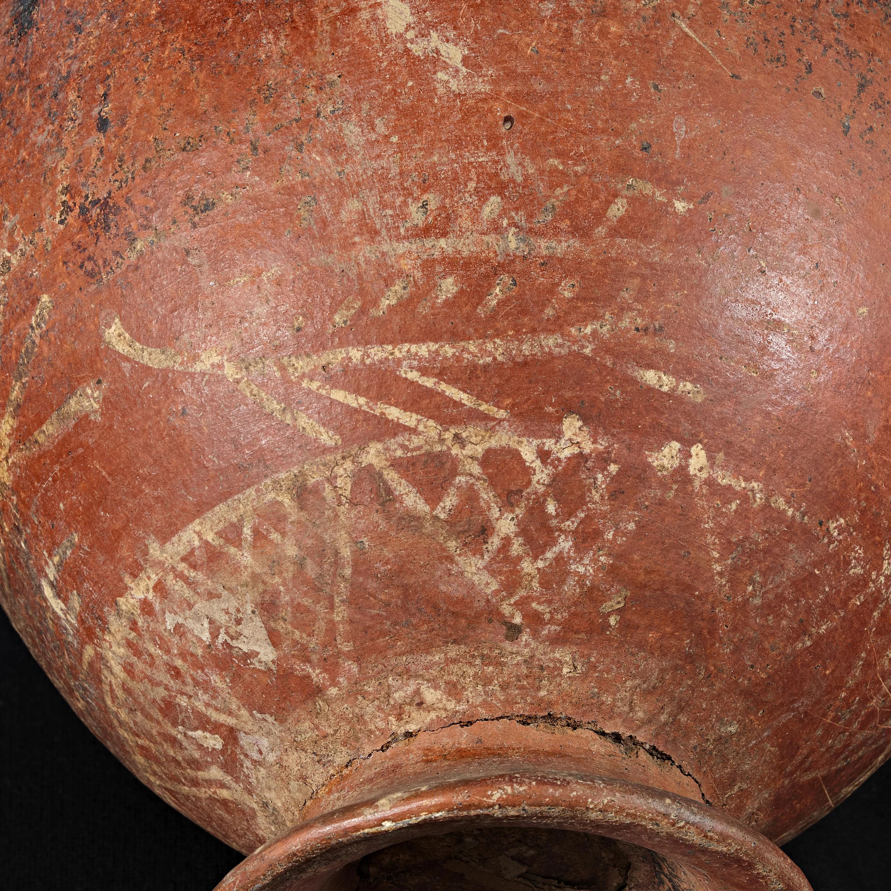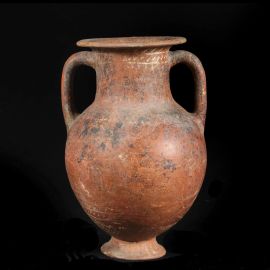 Anfora di medie dimensioni caratterizzata da un ampio labbro a tesa larga, un collo alto e largo su cui si innestano due anse a nastro ad andamento verticale fino alla spalla. Corpo globulare e piccolo piede ad imbuto. La particolare decorazione è sovradipinta in bianco su fondo rosso (tipica produzione ceramica "white-on-red"). Sul collo è visibile un decoro a fasce orizzontali che incentra elementi bianchi obliqui a reticolo; sulla vasca, non visibile, forse un registro posteriore con quadrupede. Sulla superficie più bassa della vasca sono presenti tre navi rossastre con rematori ed elementi triangolari rivolti verso il basso decorati a rete.