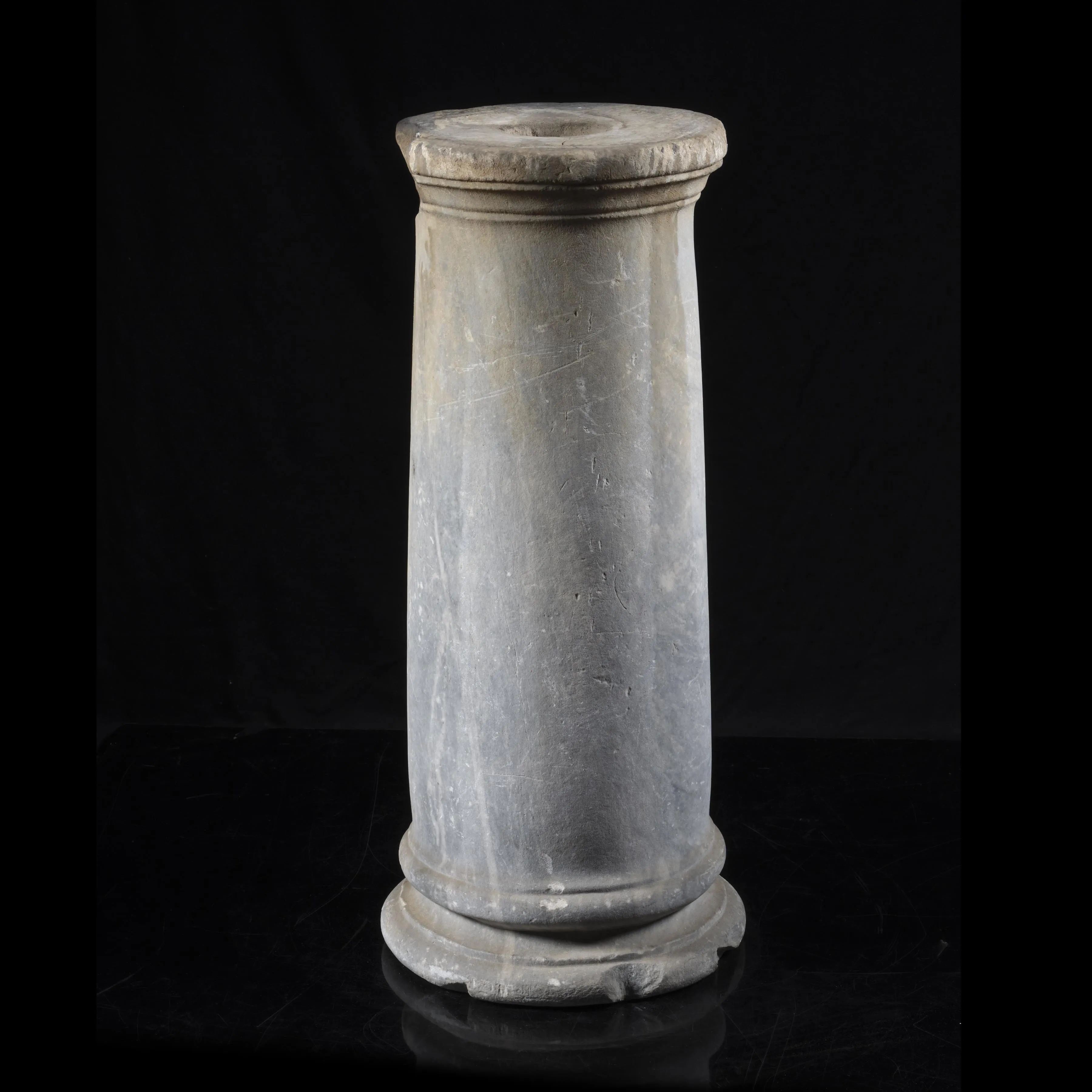 Colonna bassa a fusto liscio, tozzo, caratterizzata da un semplice plinto circolare alla base e un anello modanato sotto la parte superiore, con un incavo centrale probabilmente utilizzato per alloggiare un altro elemento, come una statua o un piccolo pilastro.