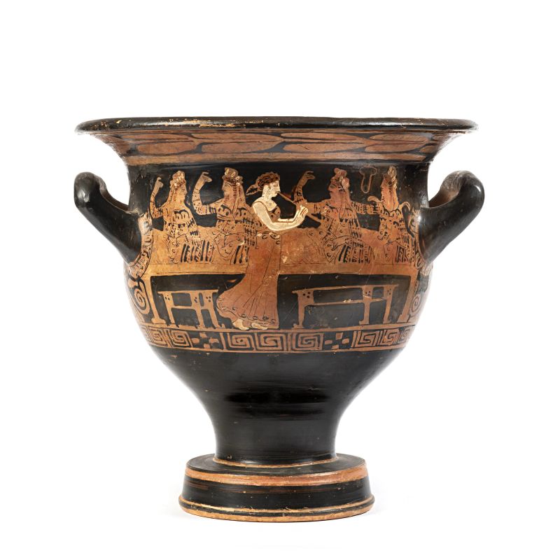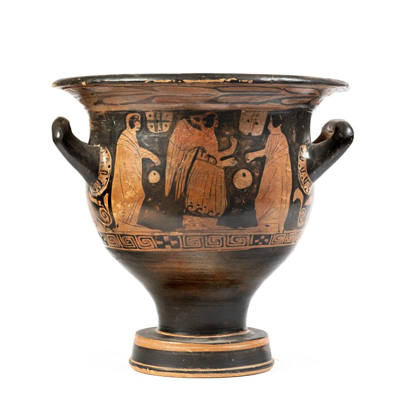 Raro cratere a campana attribuito al Pittore della Grifomachia di Oxford, in ceramica a pasta fine e vernice nera lucida, caratterizzato da ampio orlo estroflesso, corpo campaniforme, stelo cilindrico e piede a disco modanato. Presenza di due anse orizzontali impostate appena al di sotto dell'orlo, a sezione circolare e rivolte verso l'alto.