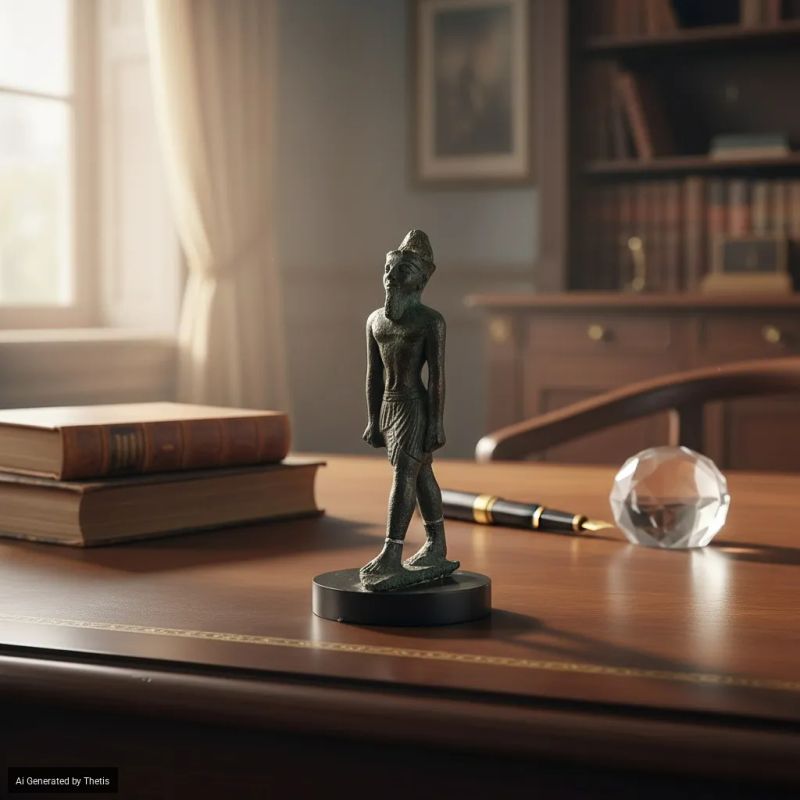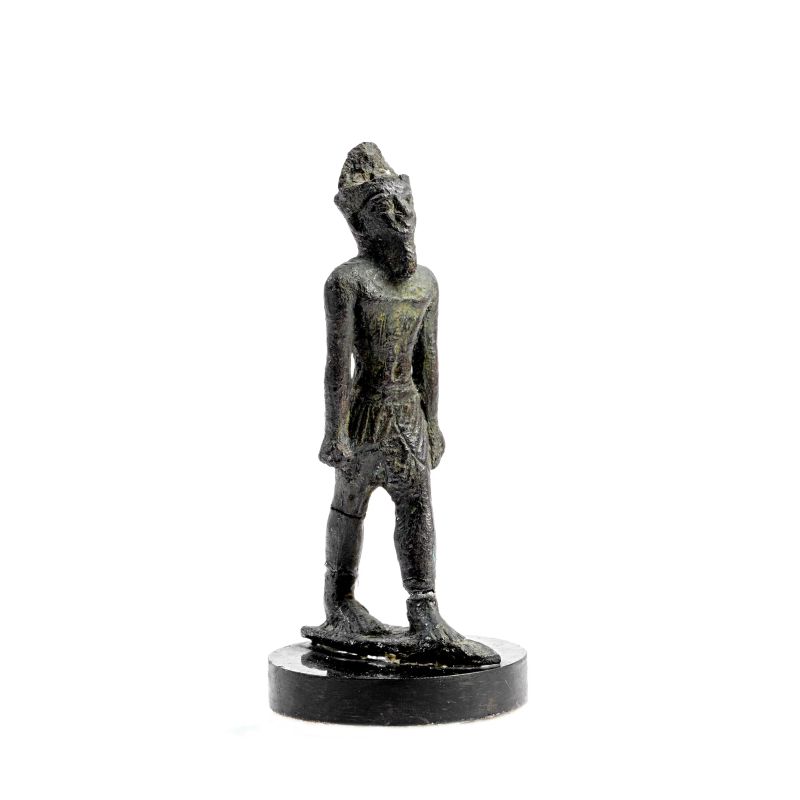 Raffigurazione del dio Amon, in piedi e frontale, con le braccia lungo i fianchi, barba posticcia, copricapo e kilt striato. I dettagli facciali sono ben marcati e resi ad incisione, così come la muscolatura del torso e i piedi.