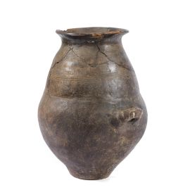 Urna biconica caratterizzata da un coperchio (non coevo e post-antico) nella tipica forma ad elmo. Il coperchio si presenta suddiviso in due parti delimitate da una superficie piatta triangolare centrale. Il cinerario è dotato di orlo estroflesso, forma biconica con spalla arrotondata e fondo piano. Dotato di due anse a bastoncello impostate orizzontalmente nei punti di massima espansione del corpo. La decorazione si presenta sotto forma di linee incise che compongono due fasce orizzontali sulla parte superiore che incentrano un motivo a meandro. Altra fascia orizzontale al centro del corpo che delimita un ampio spazio caratterizzato da motivi triangolari geometrici.