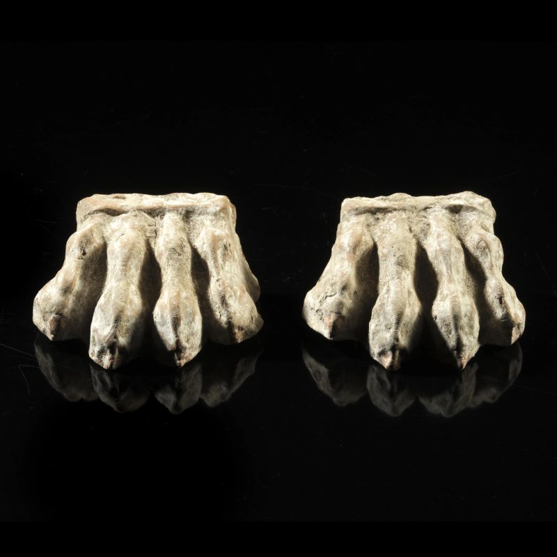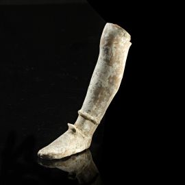Gruppo composto da due zampe leonine utilizzate originariamente come supporti, di buona fattura e caratterizzate da un buon livello di dettaglio, dotate di ingubbiatura biancastra e integre. Conservano ancora tracce di policromia. Probabilmente legate all’ambito votivo; una piccola gamba fittile caratterizzata da ingubbiatura bianca, integra dal ginocchio al piede. Conserva ancora tracce di policromia. Ambito votivo.