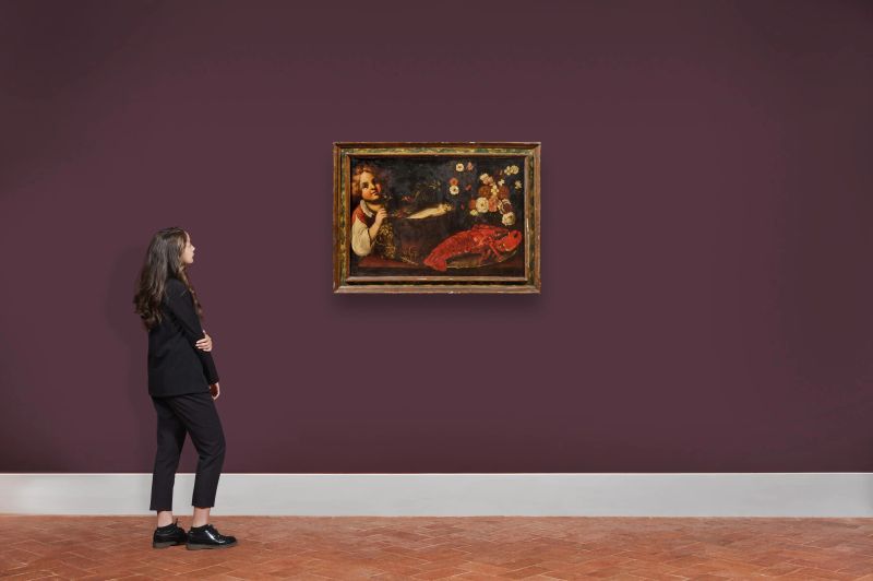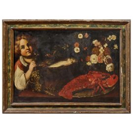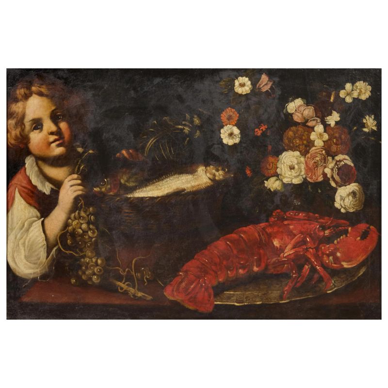 A BOY WITH FISH, FLOWERS AND A LOBSTER