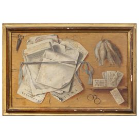 COPPIA DI TROMPE L'OEIL CON CARTE DA GIOCO, DOCUMENTI E CACCIAGIONE