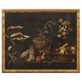 NATURA MORTA CON ORTAGGI, FUNGHI E PESCI