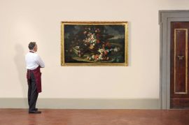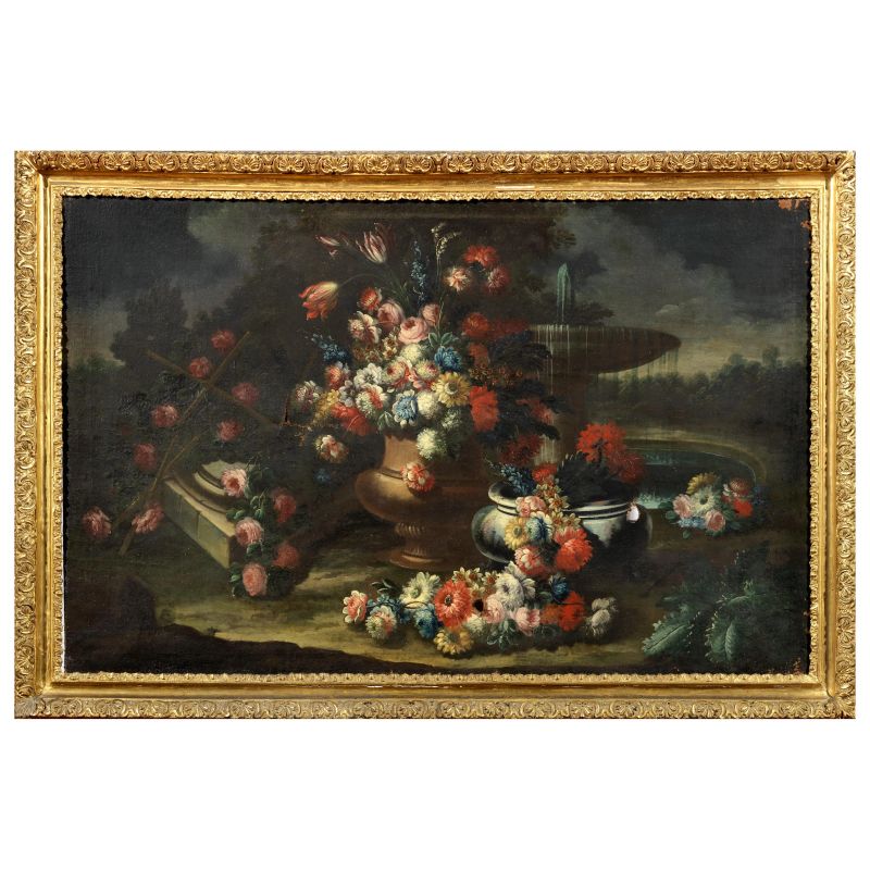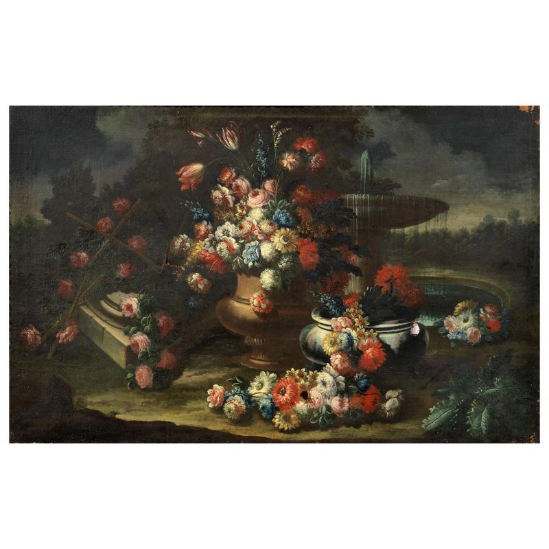 NATURA MORTA CON VASO DI FIORI, FONTANA E BASAMENTO DI COLONNA