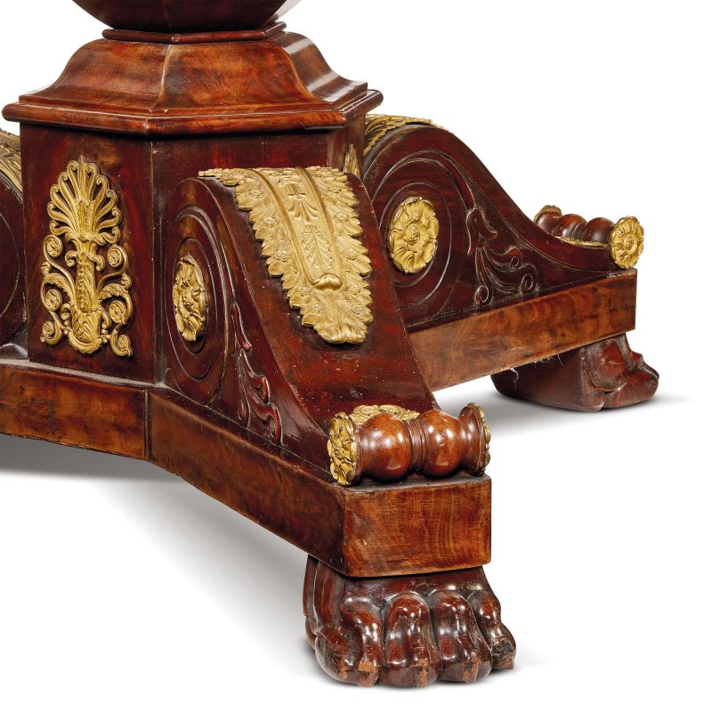 in mogano con applicazioni in bronzo dorato, piano circolare in marmo bianco scende in modanatura su fascia liscia poggiante su fusto esagonale a balaustra con base tripode intagliata e impreziosita da applicazioni in bronzo dorato e cesellato a motivo vegetale, alt. cm 72 e diam. cm 101