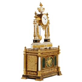 in marmo bianco e nero e bronzo dorato, di tipo "a portico", due pilastri in marmo bianco impreziositi da trionfi con strumenti musicali e volto del sole tra torciere laterali e sormontati da urna con finale a pigna, a reggere la cassa di forma circolare con quadrante in smalto bianco e numeri arabi firmato Robert & Courvoisier decorata da tralci vegetali e sormontata da vaso in marmo da cui fuoriesce un bouquet di fiori, su base di forma ovale centrata da fiore tra fregi raffiguranti putti. Cassa in legno dipinto e bronzo dorato con all'interno un organino a canne; parte superiore a terrazzino con balaustra e agli angoli boccioli, fronte centrato da ovale a fondo verde con emblemi musicali e ai lati due nicchie con balaustre, e fregio a fiori su lamina di metallo nella parte inferiore; agli angoli anteriori colonne corinzie in marmo bianco, mentre in quelli posteriori lesene scanalate in bronzo dorato e ai lati grate in bronzo su fondo in seta, cm 96x52,5x28
