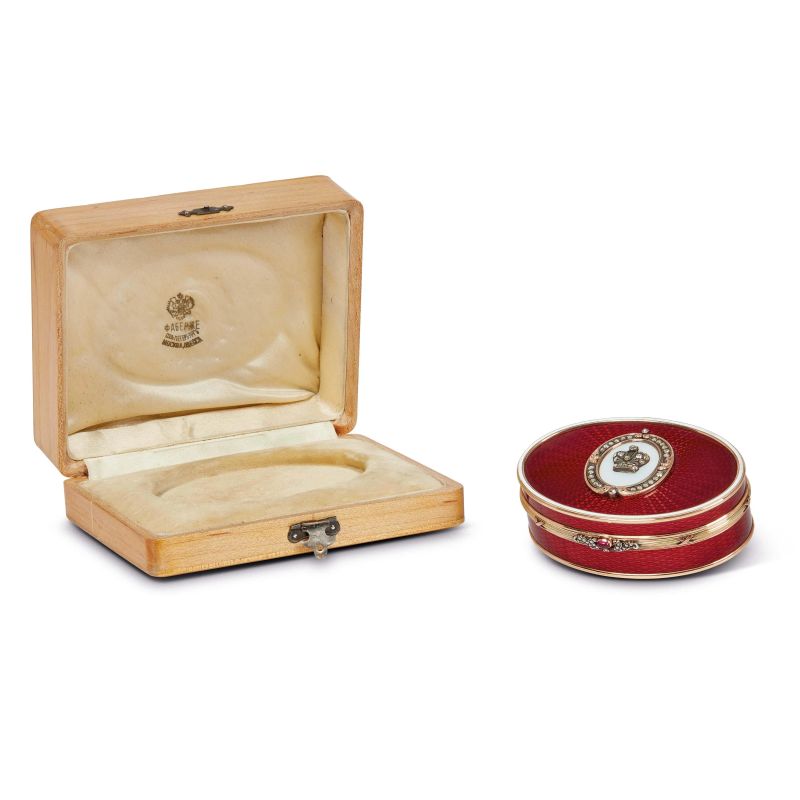 in oro e argento, di forma ovale, fondo in smalto guilloché traslucido rosso e bianco, coperchio decorato da elemento ovale centrato da corona e impreziosito da diamanti, lungo la fascia nastro legato, centrato da chiusura con rubino cabochon entro motivo vegetale impreziosito da diamanti; firmato Fabergé, punzone 56 e del fabbricante e corredata di scatola; cm 2,8x8,5x6,5