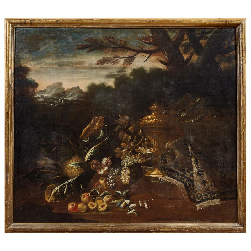 NATURA MORTA DI FRUTTA E FIORI CON TAPPETO E SUPPELLETTILI IN UN PAESAGGIO