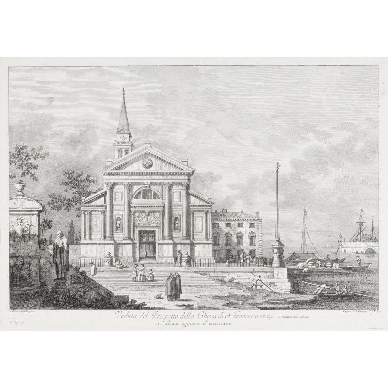 Le vedute raffigurano alcune importanti chiese veneziane inserite in ambienti di fantasia secondo i disegni di Canaletto e incise da Wagner, intagliatore raffinatissimo.
