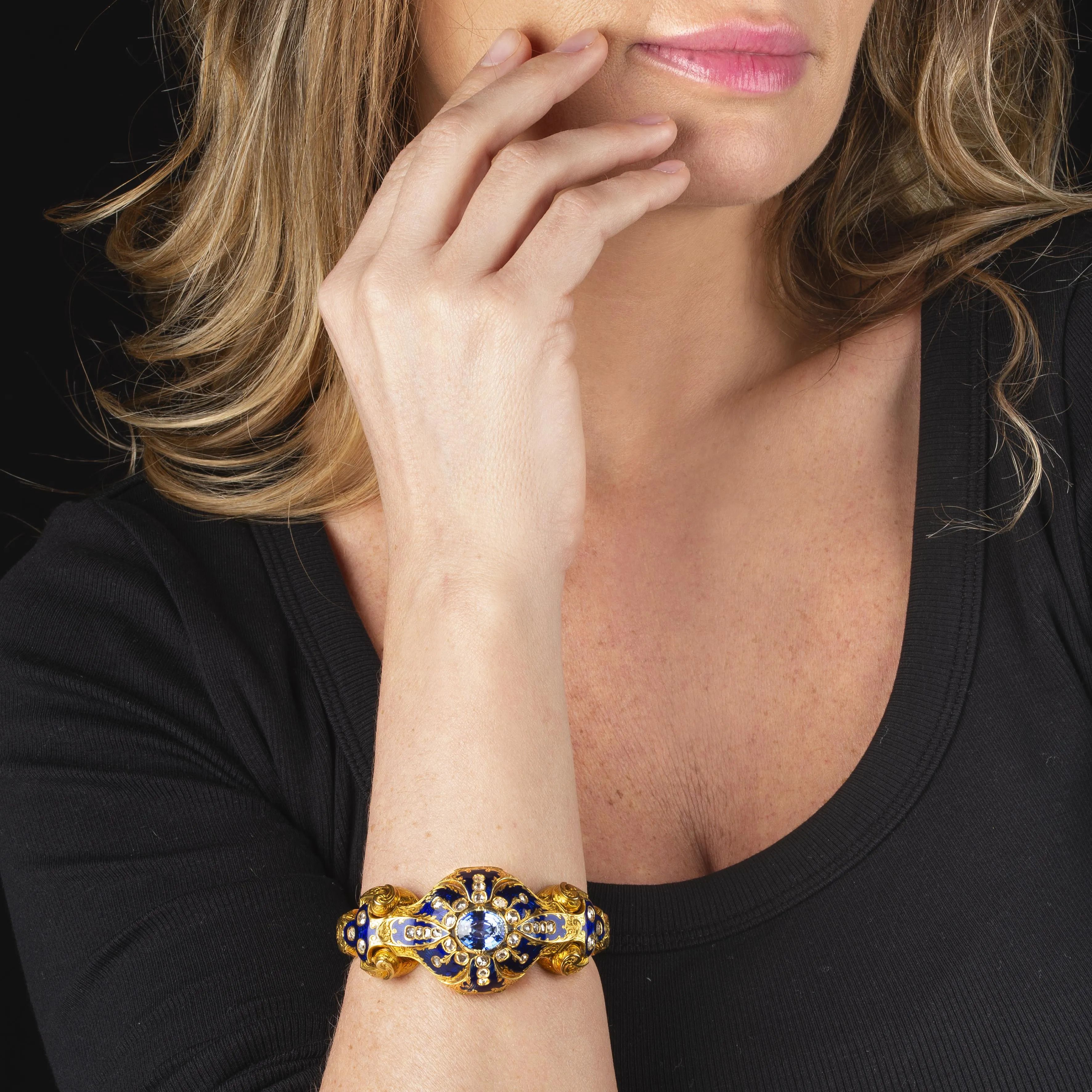 in oro giallo 18kt, con parti smaltate, impreziosito al centro da uno zaffiro sintetico, circondato da diamanti taglio a rosa, contenente al suo interno un piccolo orologio da tasca J.F Bautte amovibile, cassa in oro giallo 18kt, fondello guillochè, decorato con elementi floreali e fogliacei, quadrante bianco (difetti), numeri romani, lancette Luigi XV, movimento a chiavetta, chiusura a cassetta, punzoni francesi, diam. cm 6, gr. 64