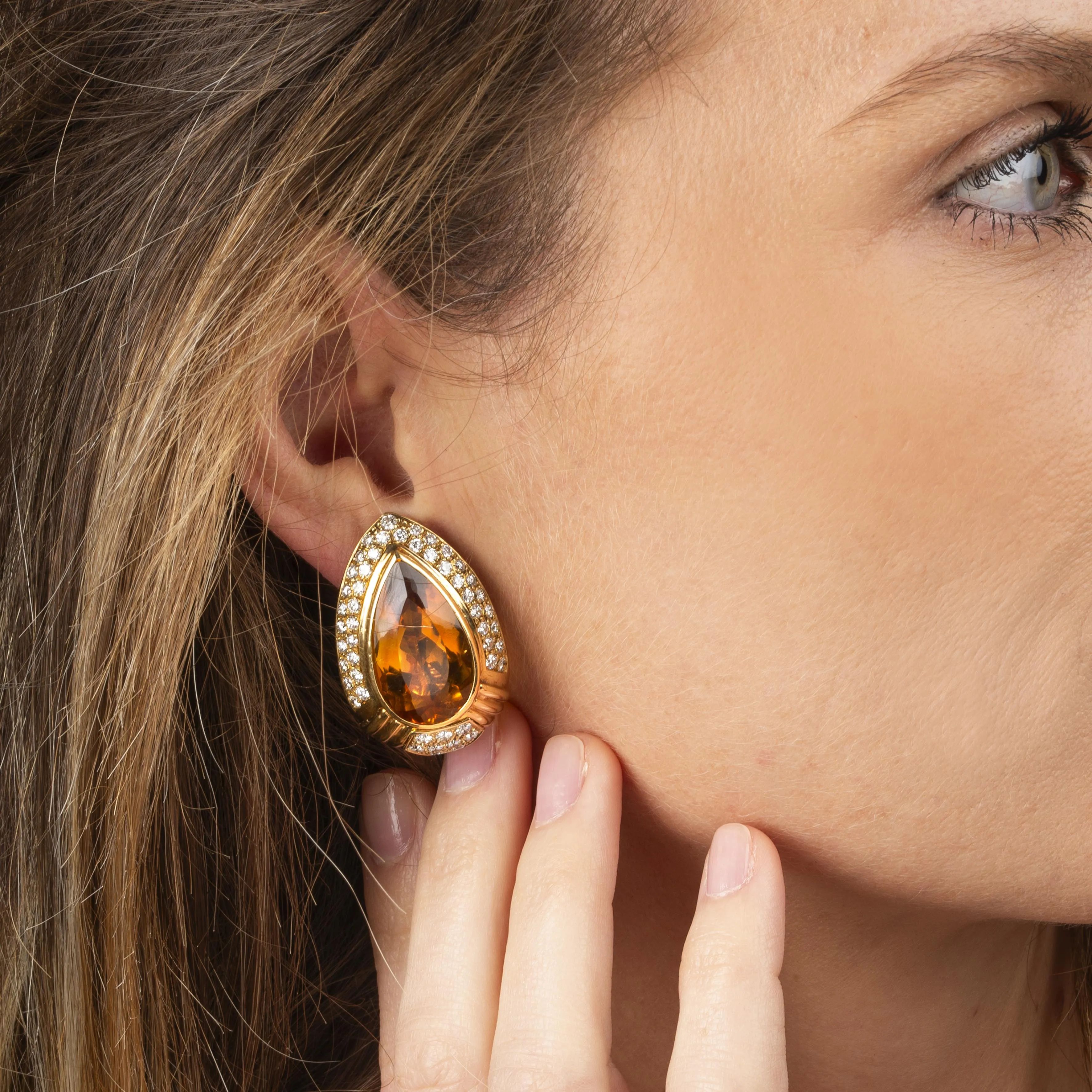 in oro giallo 18kt, a lobo, impreziositi al centro da una coppia di quarzi citrini taglio a goccia per ct 17 circa, circondati da diamanti taglio brillante per ct 3.30 circa, chiusura a clip, firmati Boucheron Paris, punzoni francesi e del fabbricante, numero seriale, dim. cm 2.5x3.5, gr. 34