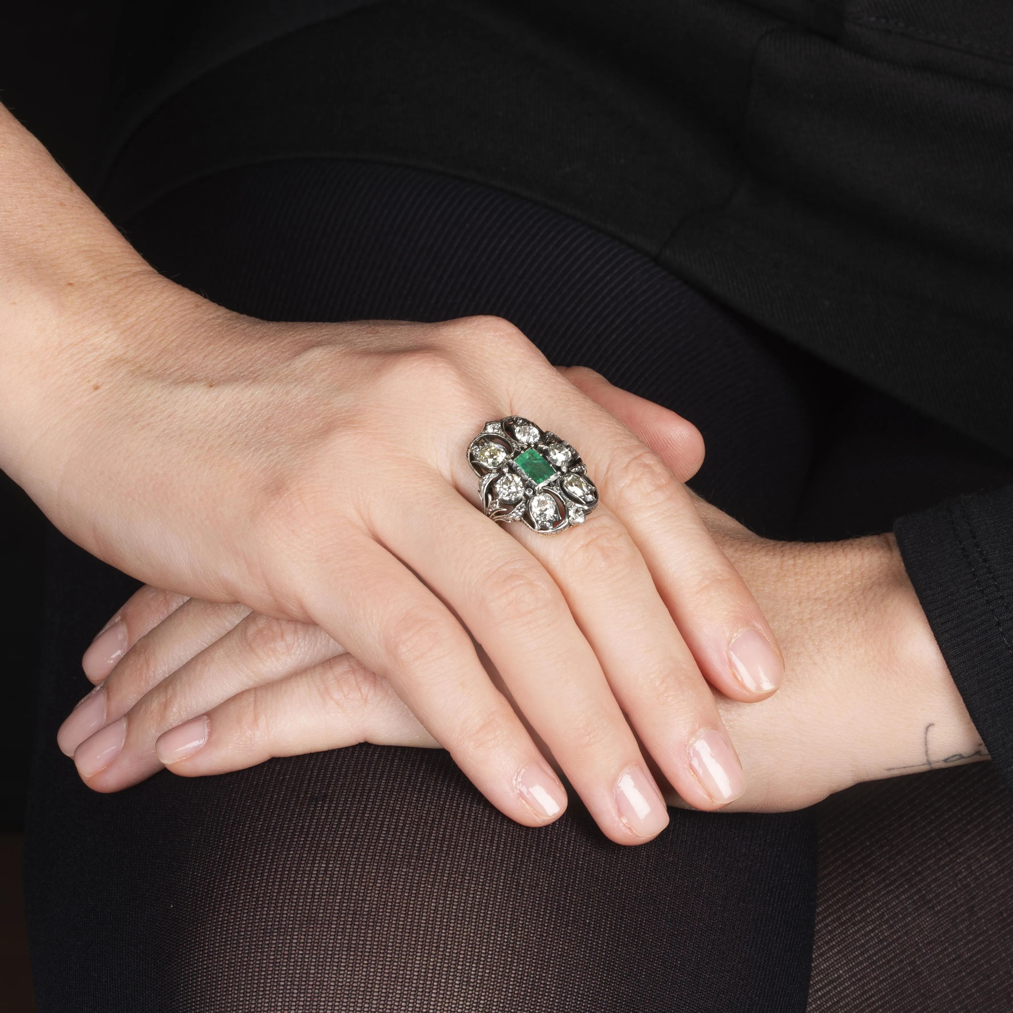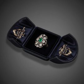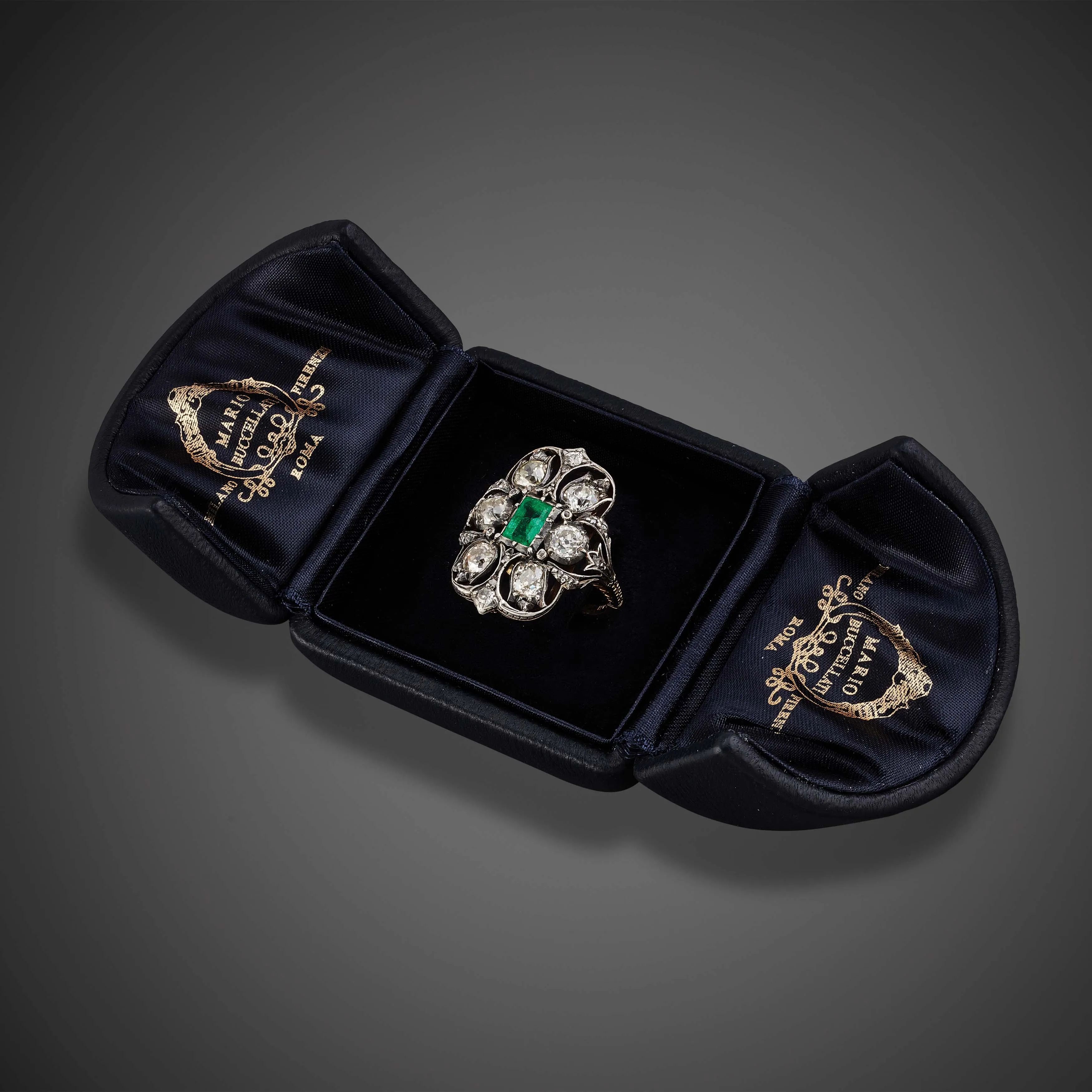in argento e oro giallo 18kt, impreziosito al centro da uno smeraldo taglio ottagonale di ct 0.60 circa, e circondato da diamanti taglio antico per ct 3 circa, firmato M. Buccellati, mis. 17/57, gr. 8. Corredato di scatola.