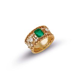 in oro giallo 18kt traforato e inciso, impreziosito al centro da uno smeraldo taglio ottagonale di ct 0.80 circa, affiancato da diamanti taglio brillante per ct 0.80 circa (difetti), firmato Buccellati, mis. 12/52, gr. 6