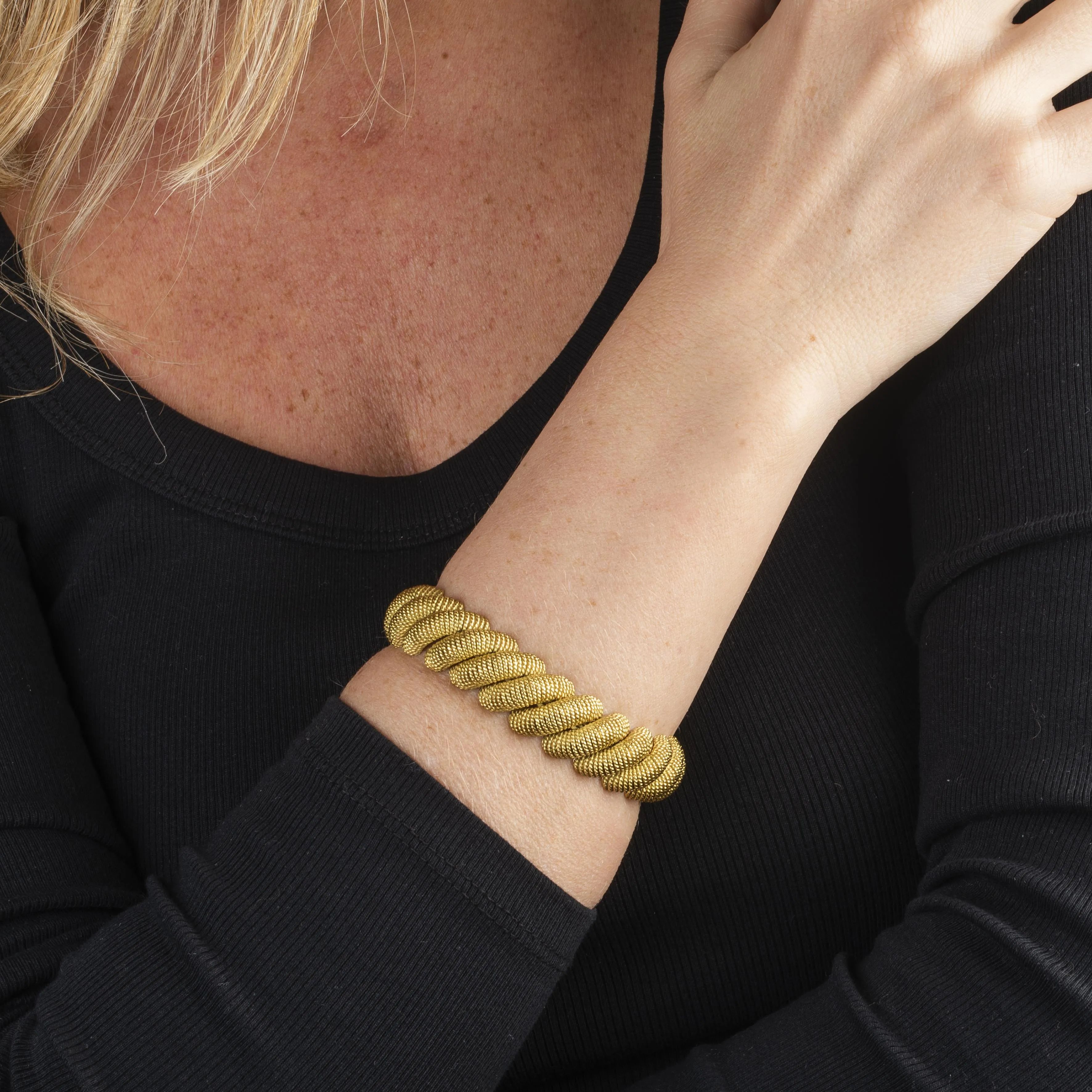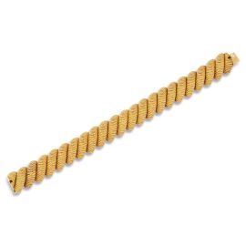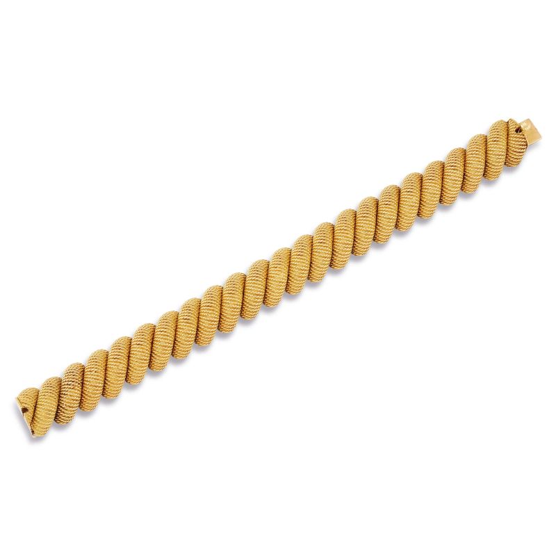in oro giallo 18kt, composto da una serie di segmenti, chiusura a cassetta con sicurezza, punzone 750 e del fabbricante, firmato Bulgari, lungh. cm 18.3, gr. 82