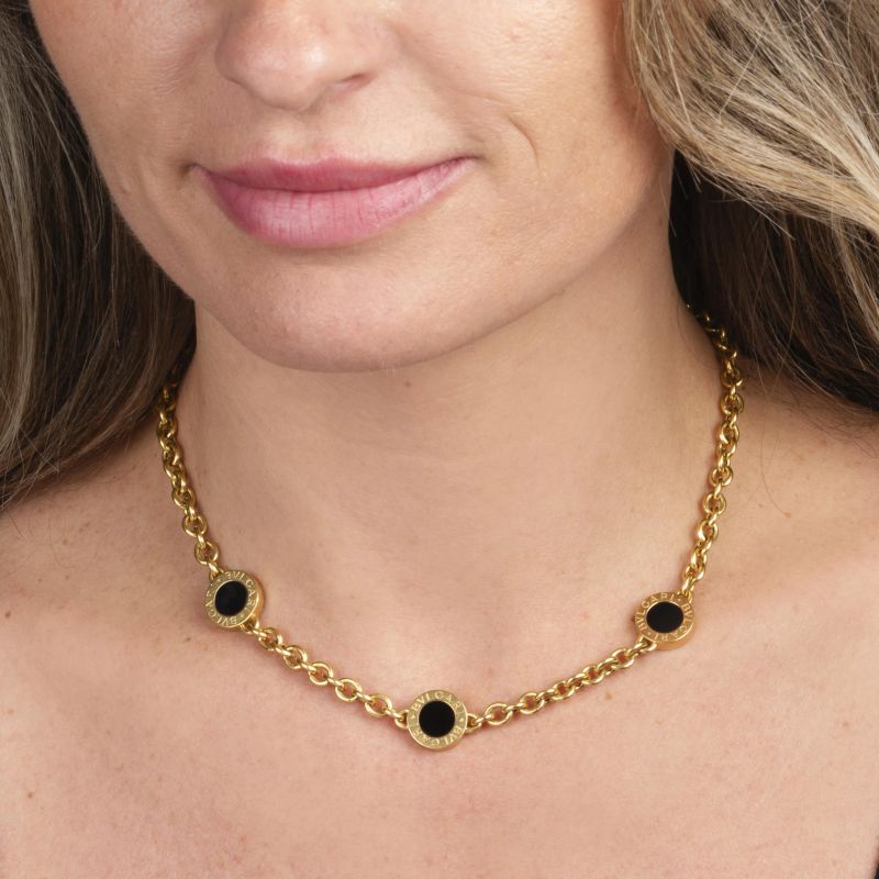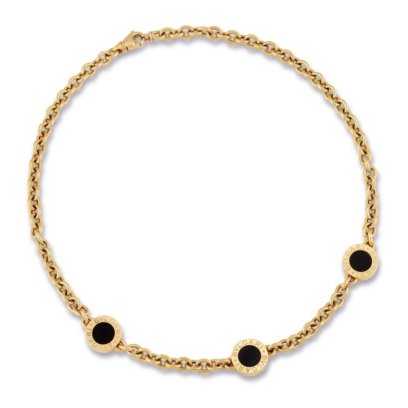 in oro giallo 18kt, realizzato a catena, con tre dischi in onice firmati Bulgari Bulgari, punzone 750 e del fabbricante, marcato Made in Italy, chiusura a moschettone, lungh. cm 40.5, gr. 30. Corredato di scatola.