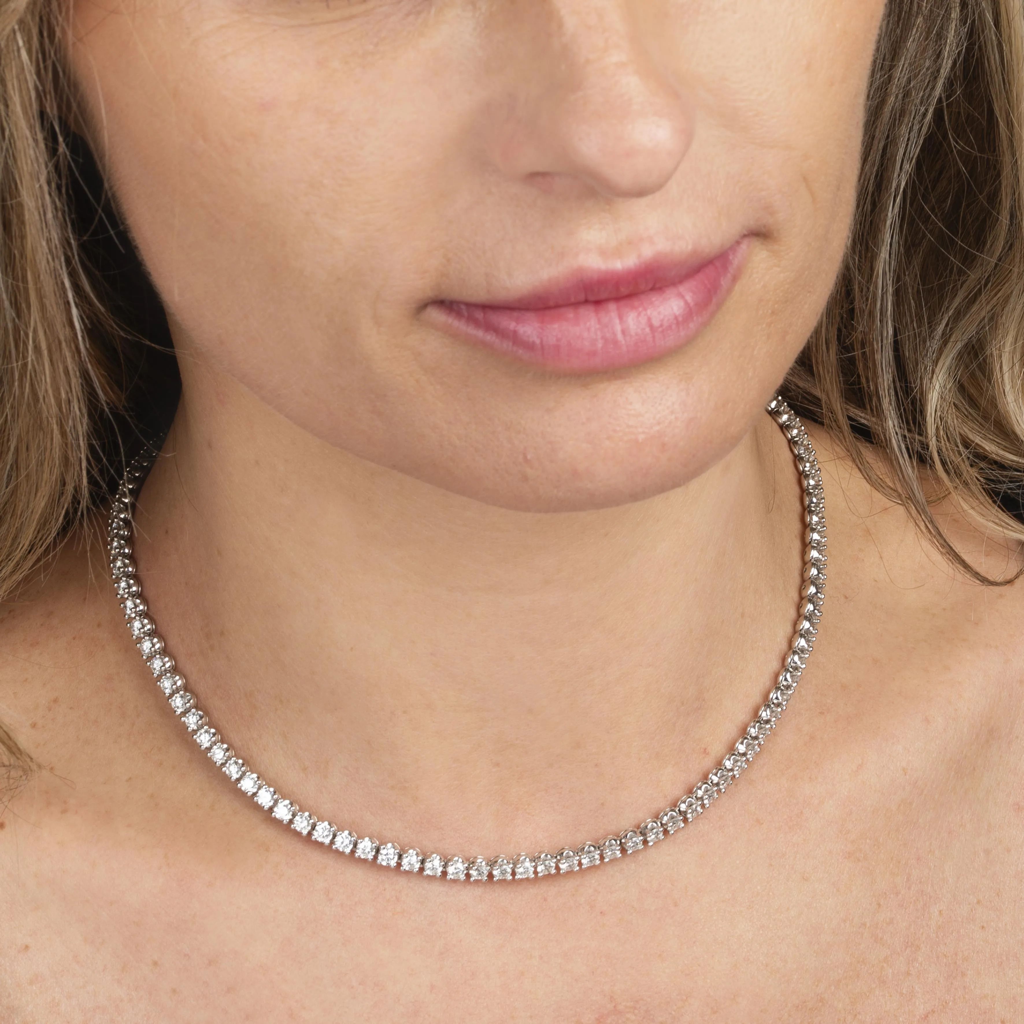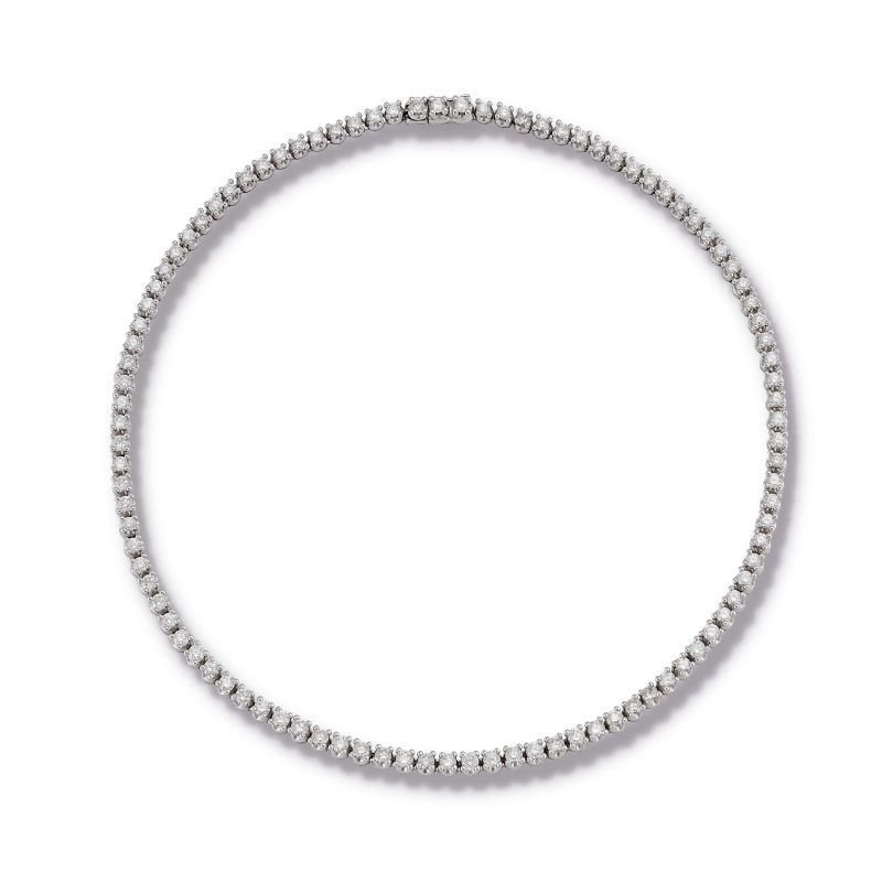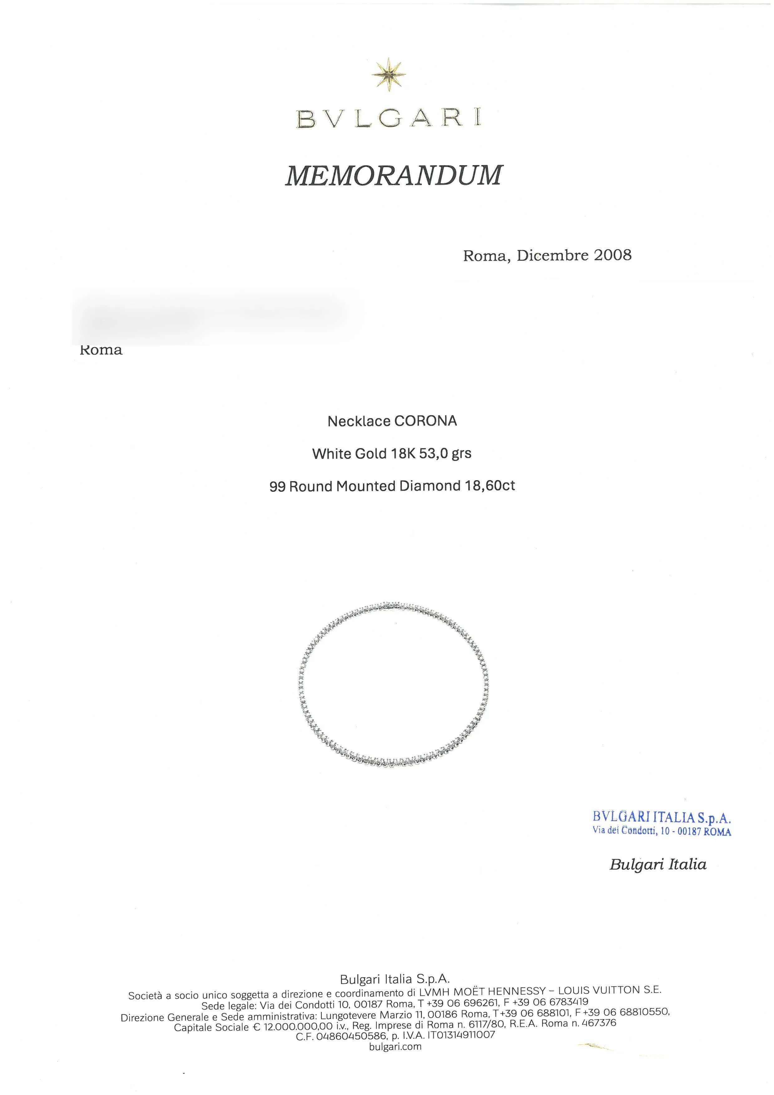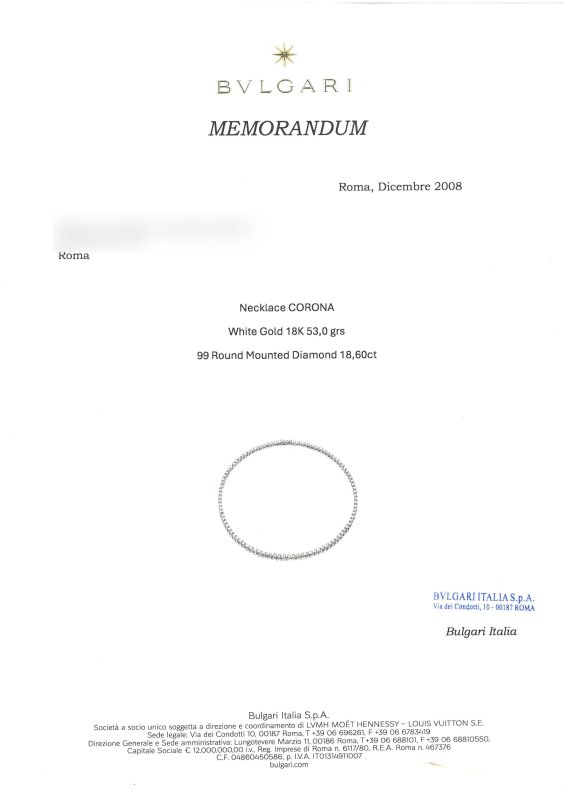 in oro bianco 18kt, impreziosita da una fila di diamanti taglio brillante per ct 18 circa, chiusura a cassetta con sicurezza, punzone 750 e del fabbricante, firmata Bulgari, marcato Made in Italy, lungh. cm 41, gr. 38. Corredata di memorandum del dicembre 2008 e astuccio.