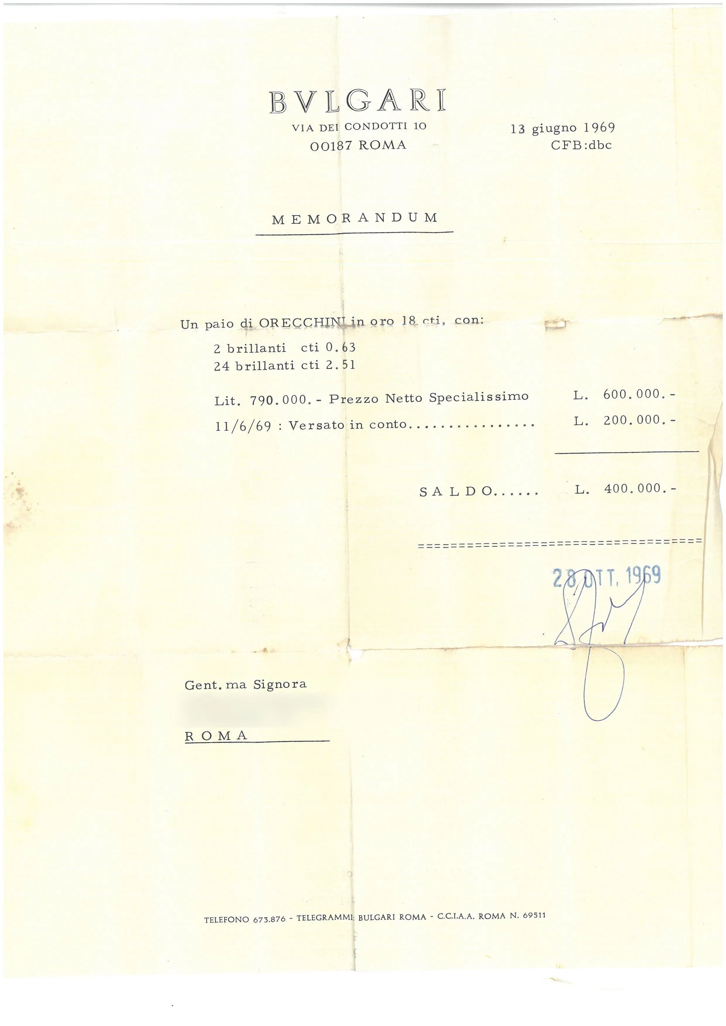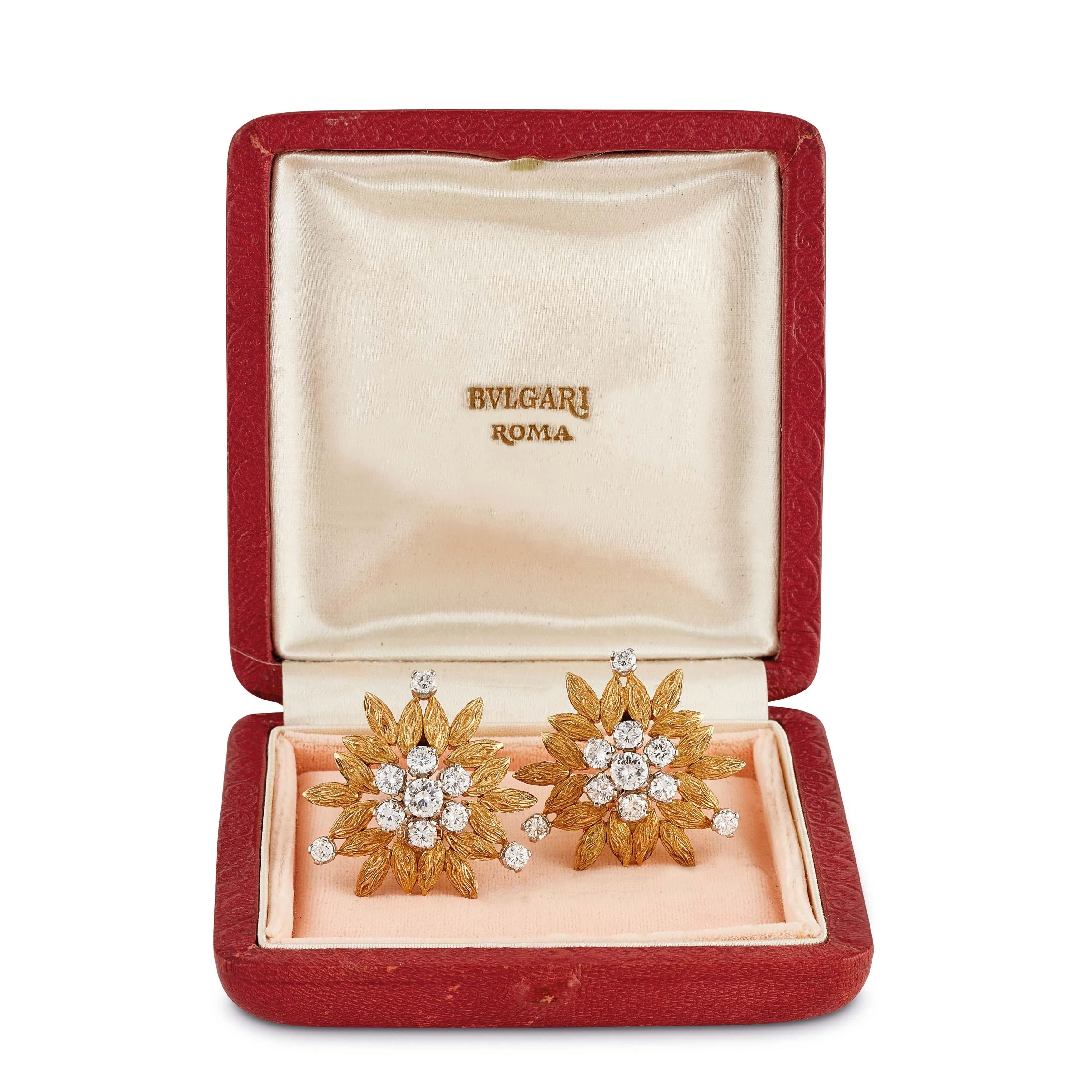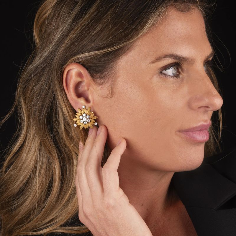 in oro giallo e bianco 18kt, a forma di fiore, impreziositi al centro da una coppia di diamanti taglio brillante per ct 0.70 circa, circondati da diamanti taglio brillante per ct 3 circa, firmati Bulgari, dim. cm 2.5x2, gr. 27. Corredati di Memoradum di acquisto del 13/06/1969 e astuccio.
