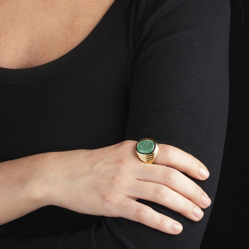 in oro giallo 18kt con scanalature, impreziosito da uno smeraldo inciso, firmato Bulgari, punzone 750 e del fabbricante, mis. 20/60, gr. 40