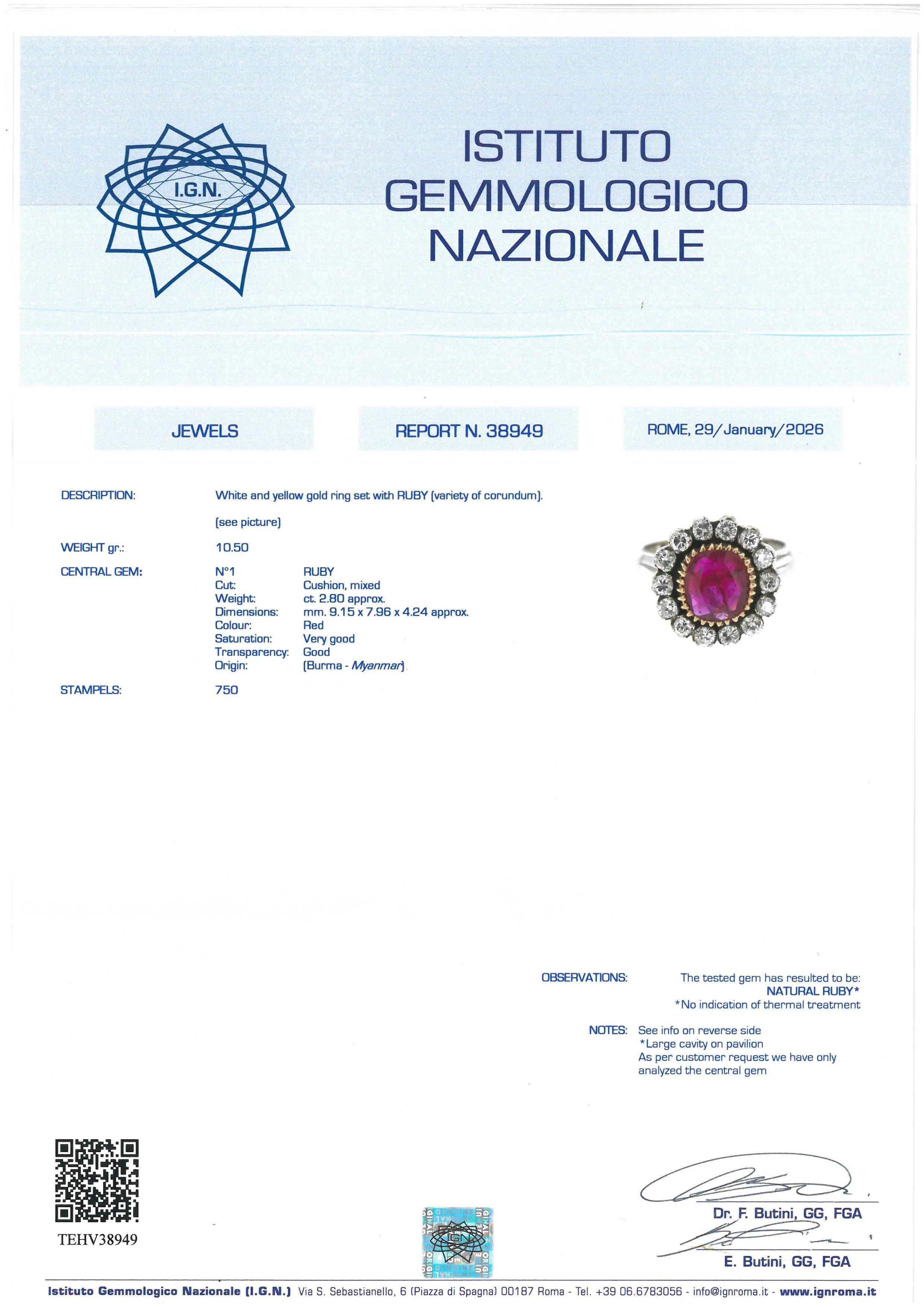 in oro bianco e giallo 18kt, impreziosito al centro da un rubino birmano taglio ovale di ct 2.80 circa, circondato da diamanti taglio brillante per ct 0.90 circa, punzone 750, mis. 12/52, gr. 10. Corredato di certificato IGN del 29/01/2026 attestante l'origine geografica della pietra e l'assenza di trattamenti termici.