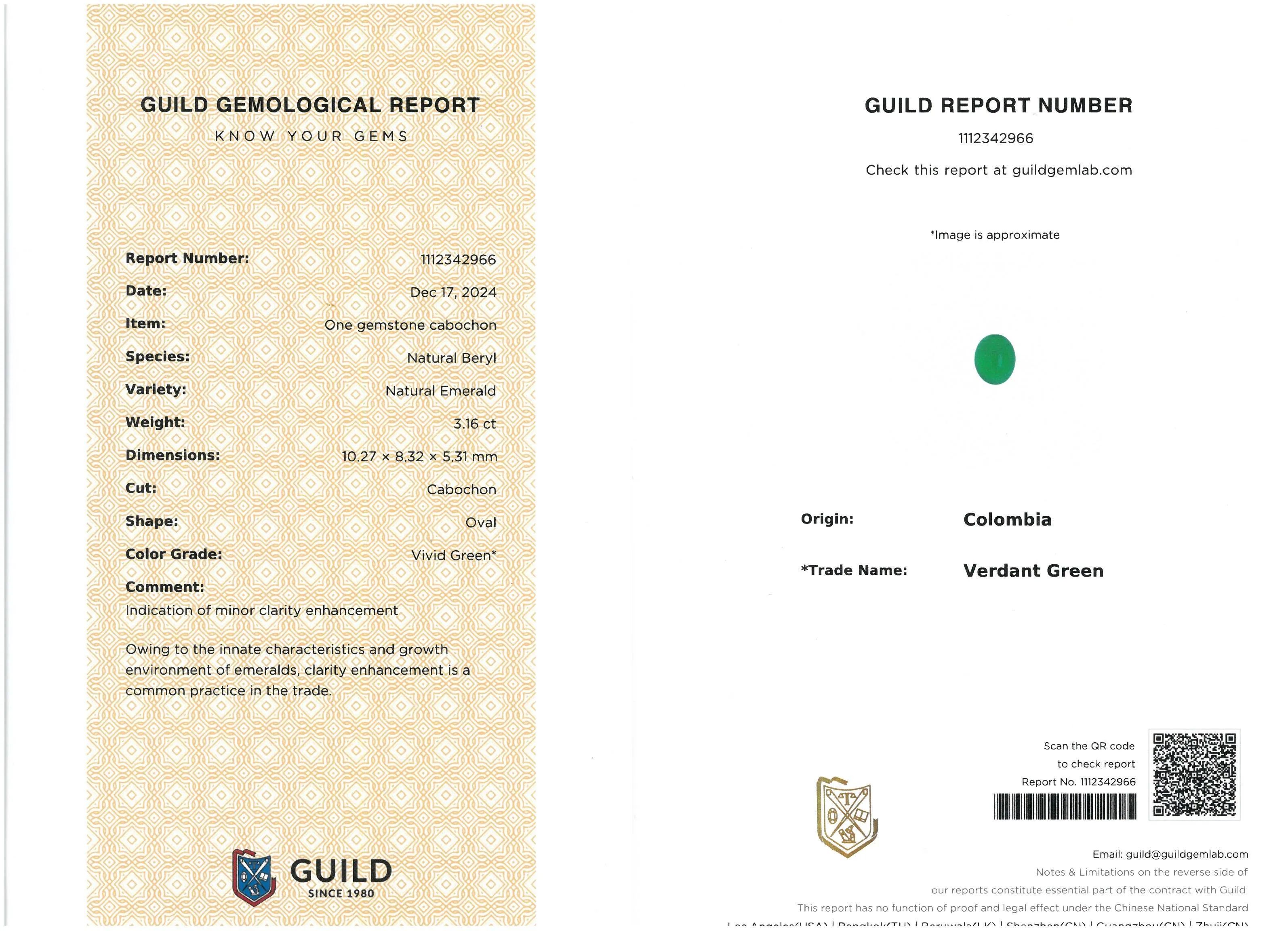 in oro bianco 18kt, impreziosito al centro da uno smeraldo colombiano taglio cabochon ovale di ct 3.16, circondato da diamanti taglio brillante per ct 2.23, punzone 750, mis.12/52, gr. 7. Corredato di certificato Guild Gemological Report del 17/12/2024 attestante l'origine geografica e le caratteristiche della pietra.