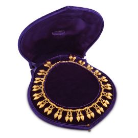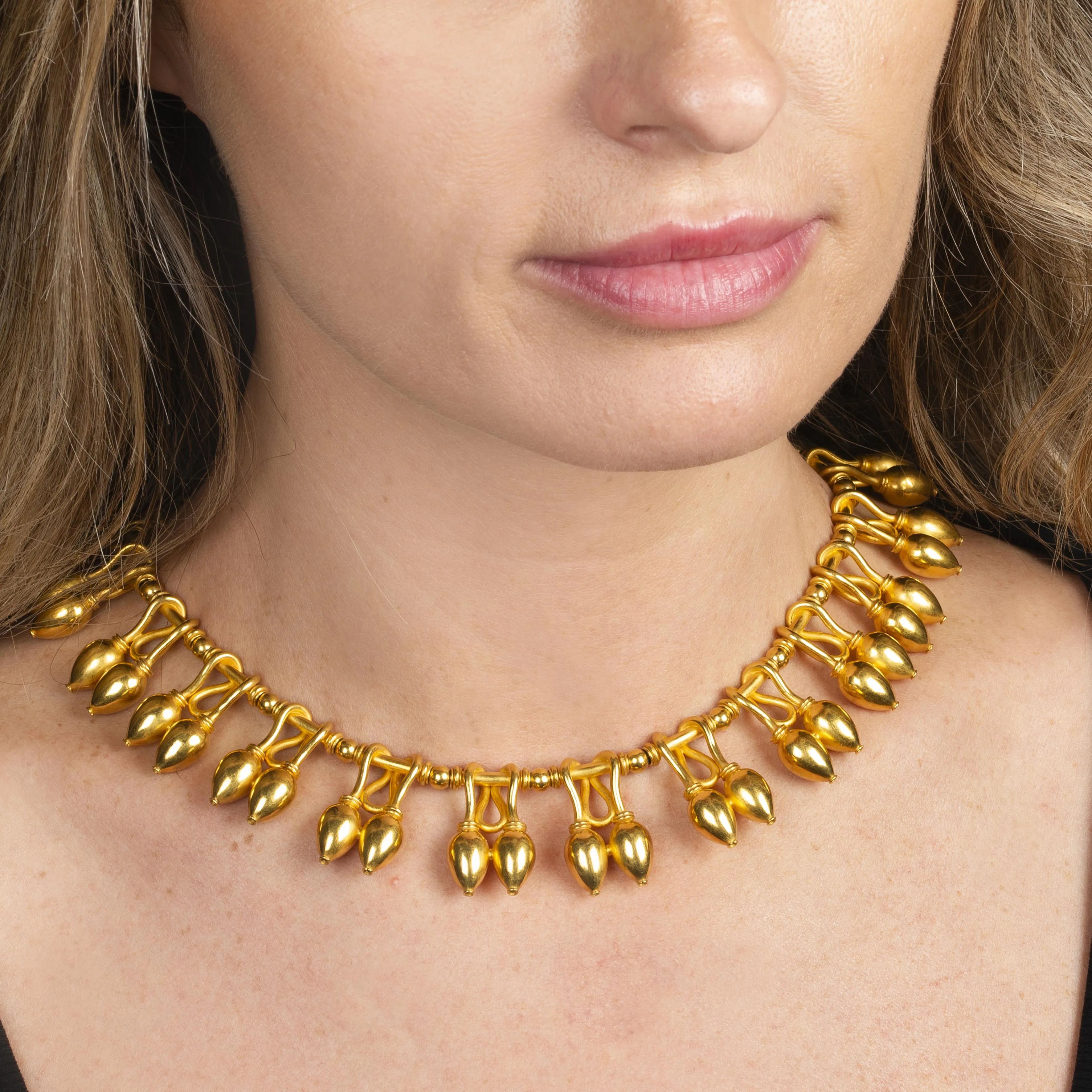 in oro giallo 18kt, composto da un girocollo in oro a forma di corda e una serie di elementi mobili passanti pendenti a forma di goccia doppia alternati da piccole sfere, diam. cm 12.3, gr. 90