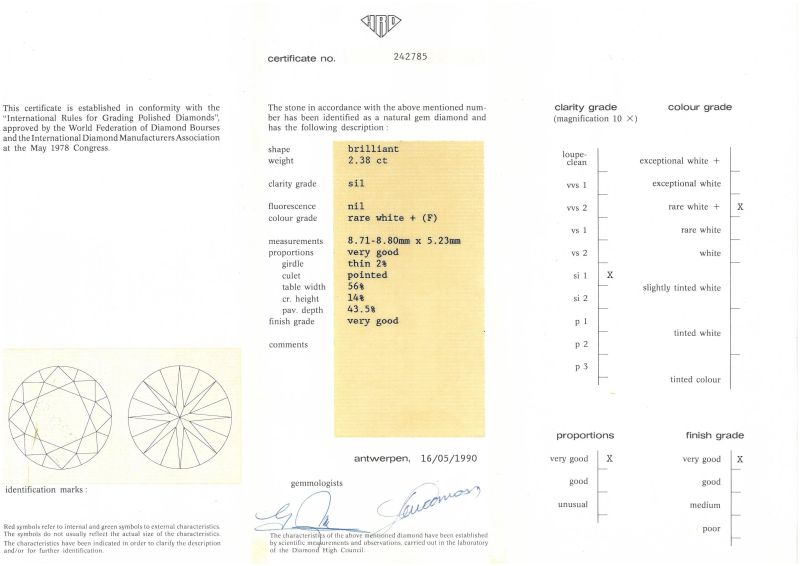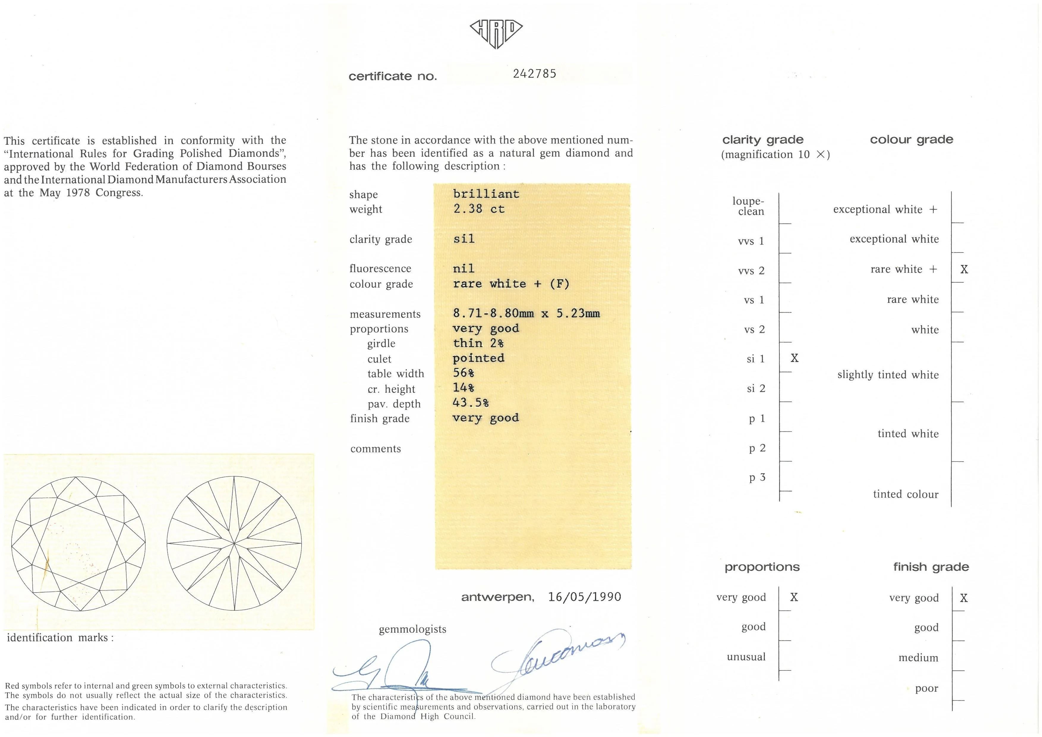 in oro giallo 18kt, impreziosito da un diamante taglio brillante di ct 2.38, colore F, purezza Si1, diamanti taglio navette per ct 0.70 circa, diamanti taglio carrè per ct 0.60 circa, firmato Damiani, punzone 750 e del fabbricante, mis. 13/53, gr. 6. Corredato di certificato HRD del 16/05/1990 attestante le caratteristiche della pietra.