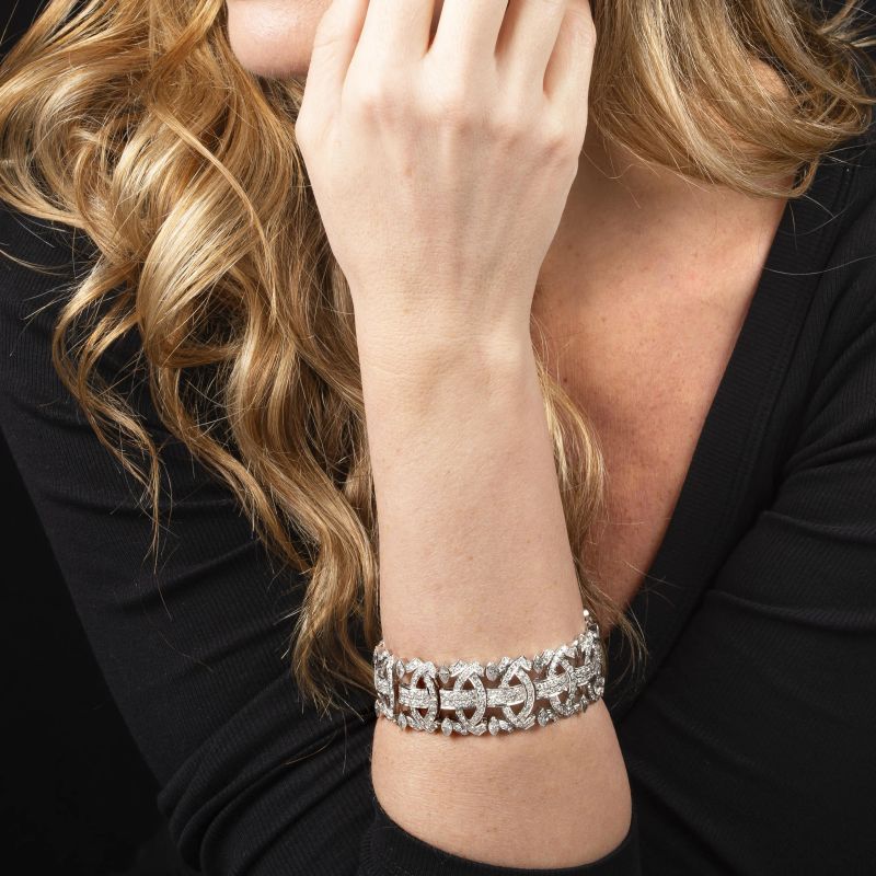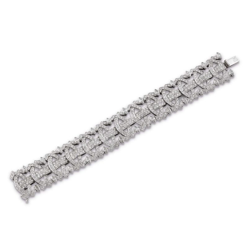 in oro bianco 18kt, segmenti impreziositi da diamanti taglio brillante e navette per ct 18 circa, lungh. cm 19.5, chiusura a cassetta con sicurezza, punzone 750, lungh. cm 20, gr. 68