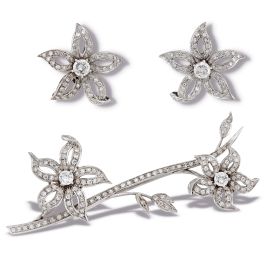 composta da una spilla "tremblant" floreale in oro bianco 18kt, impreziosita da diamanti taglio brillante per ct 2.50 circa e diamanti taglio huit huit per ct 0.80 circa, dim. cm 8x4, e da un paio di orecchini floreali in oro bianco 18kt, impreziositi al centro da una coppia di diamanti taglio brillante per ct 1 circa, e diamanti taglio huit huit, chiusura a clip con perno, dim. cm 2.5x2.5, peso totale gr. 28